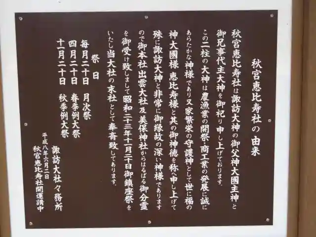 | 御朱印 | あり 右に信濃國一宮、真ん中に諏訪大社、左に下社秋宮と書かれ、右上に信濃一宮の印、諏訪大社の社印が押された御朱印です。 |