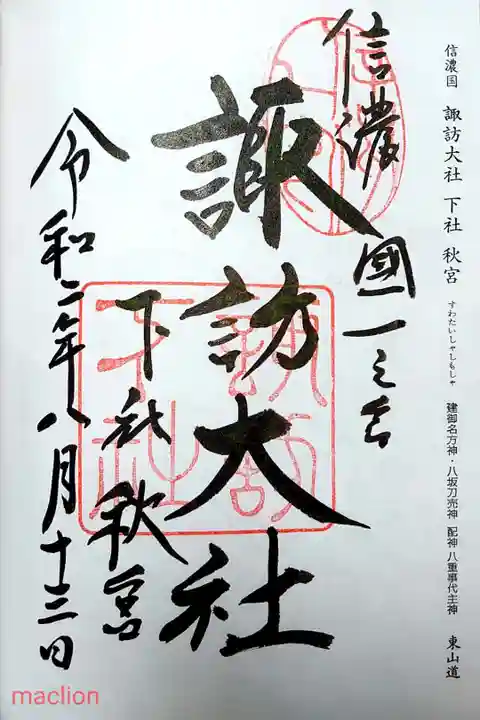 8月から1月の間に『秋宮』に神様がいらっしゃるということで、3番目は『秋宮』。