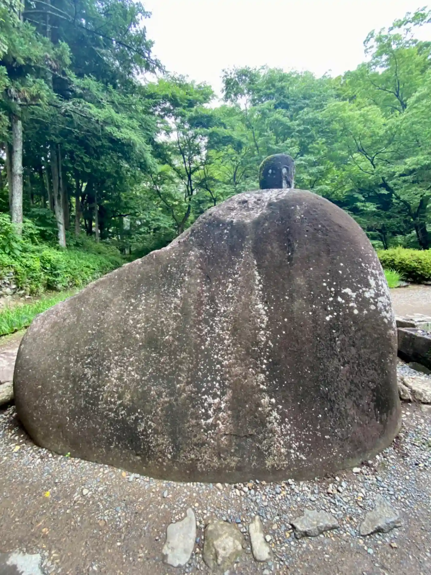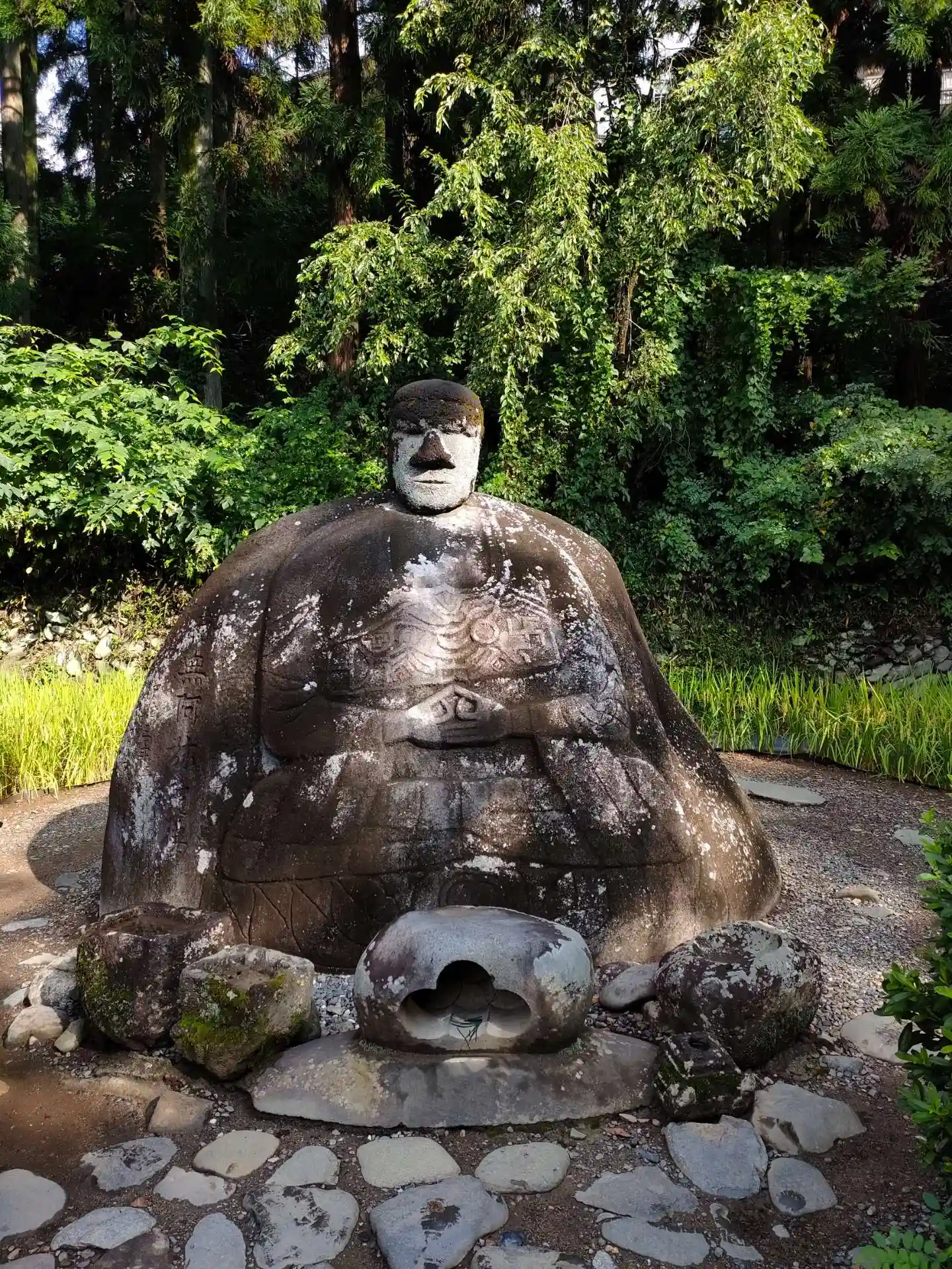 巨大な自然石の胴体に対してアンバランスな頭がちょこんと乗るユーモラスな風貌に加え、胸部に描かれた逆卍(ぎゃくまんじ)や雷、月や太陽などの記号がミステリアスで、芸術家、岡本太郎氏がカメラを持つ手をふるわせながら「世界中歩いているが、こんなに面白いものは見たことがない」と絶賛し、全国に紹介されたことから有名になりました。