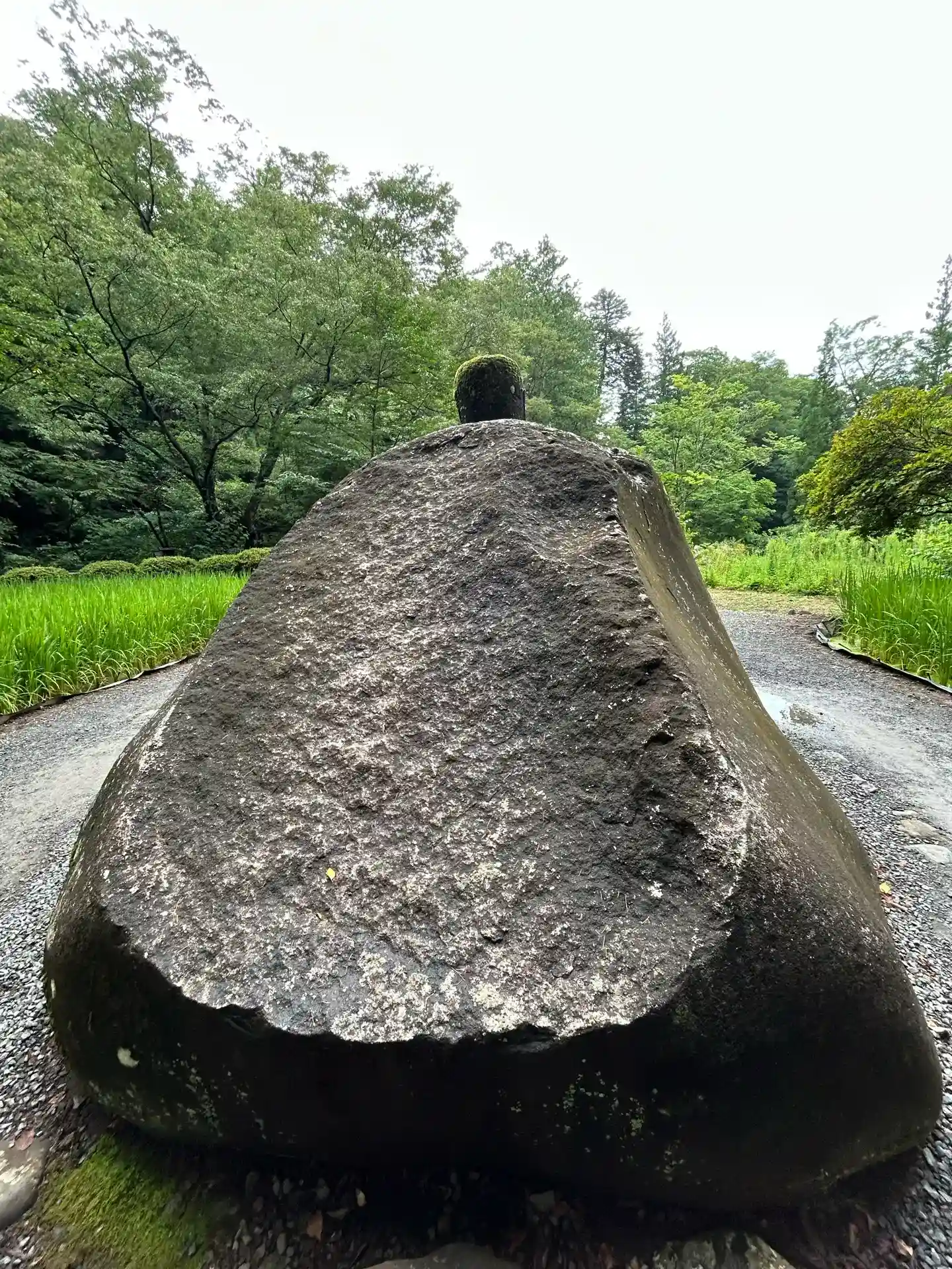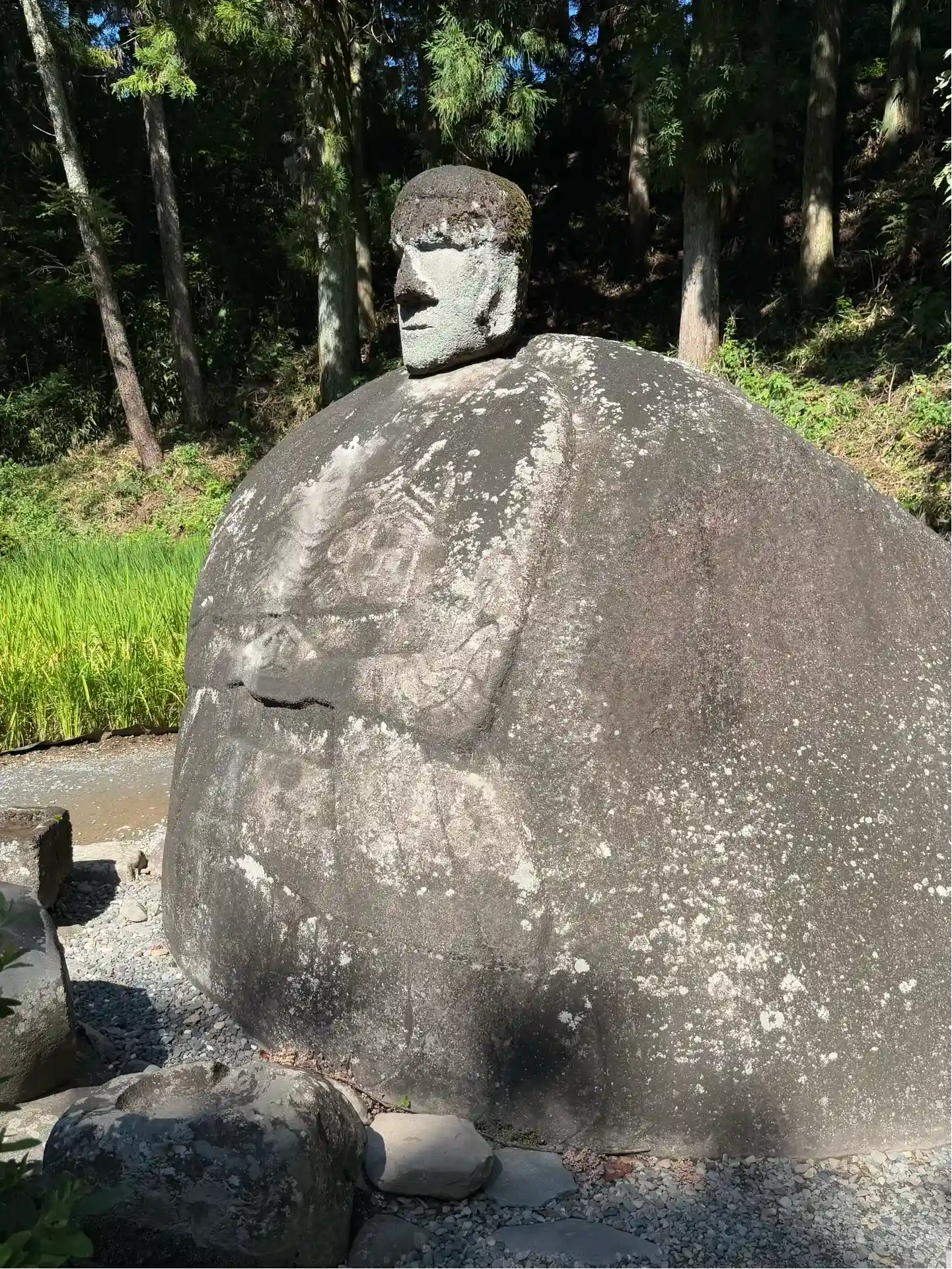 春宮の境内から朱塗りの浮島橋をわたり、歩くこと3分。稲穂のさざめく田んぼに囲まれ、どんっと鎮座しているのが万治の石仏です。