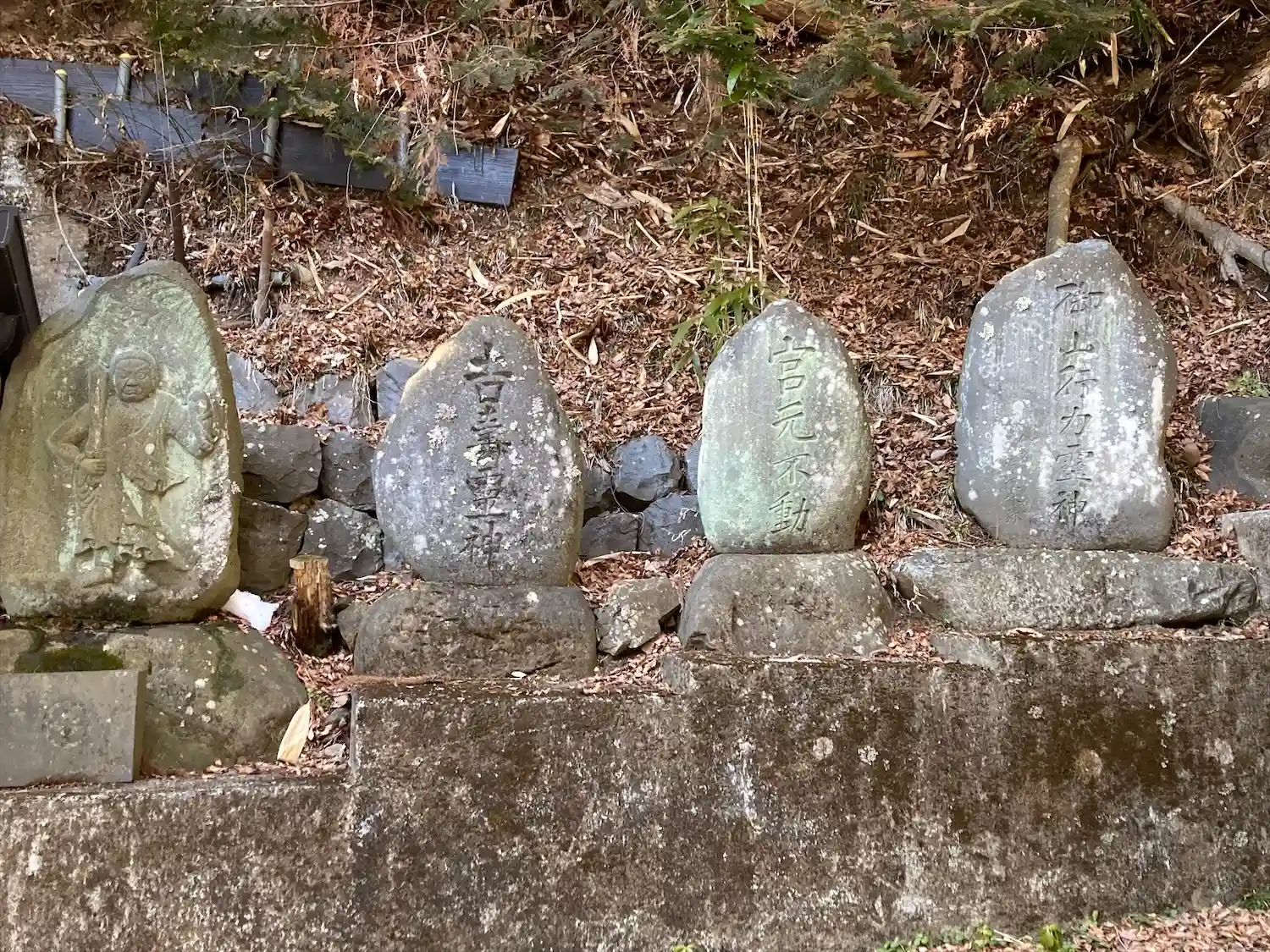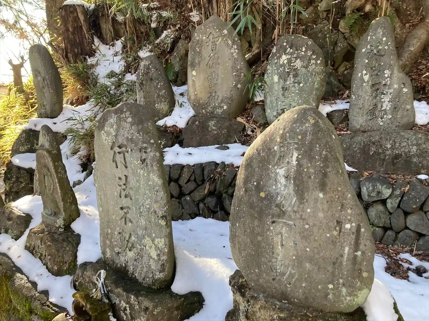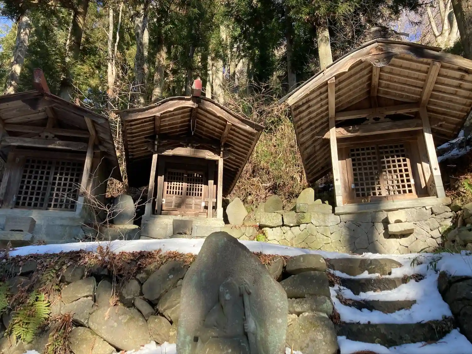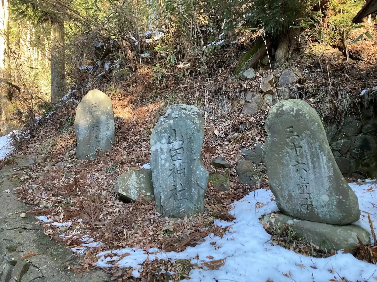 諏訪大社下社秋宮から北に750メートル行った津島神社の道を挟んで東側に位置する大岩不動尊は、入り口左に高尾穂見之宮があり、鳥居⛩️をくぐった左側に御射響稲荷神社があり、渓谷の坂道に沿ってびっしりと霊神、石碑、祠、石仏が並んでいます。参道は残雪で滑りましたが、頂上まで登るとニ山社、駒岳社、御嶽社の三社が祀られていました。一帯を総じて大岩不動尊と呼ばれています。