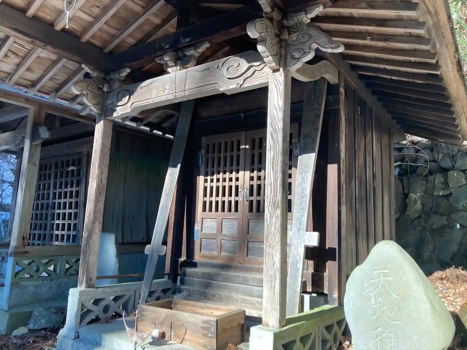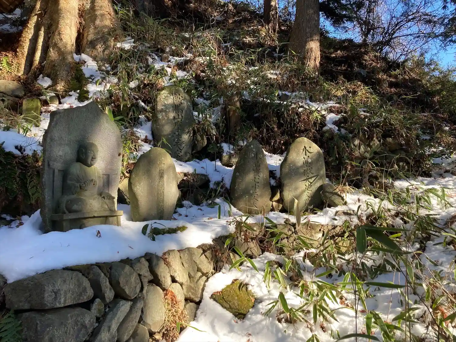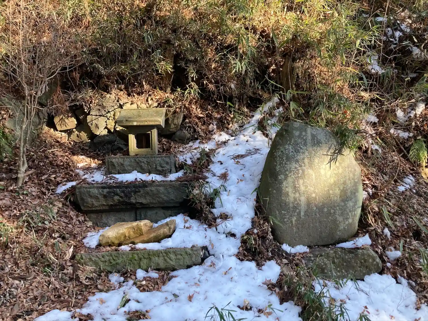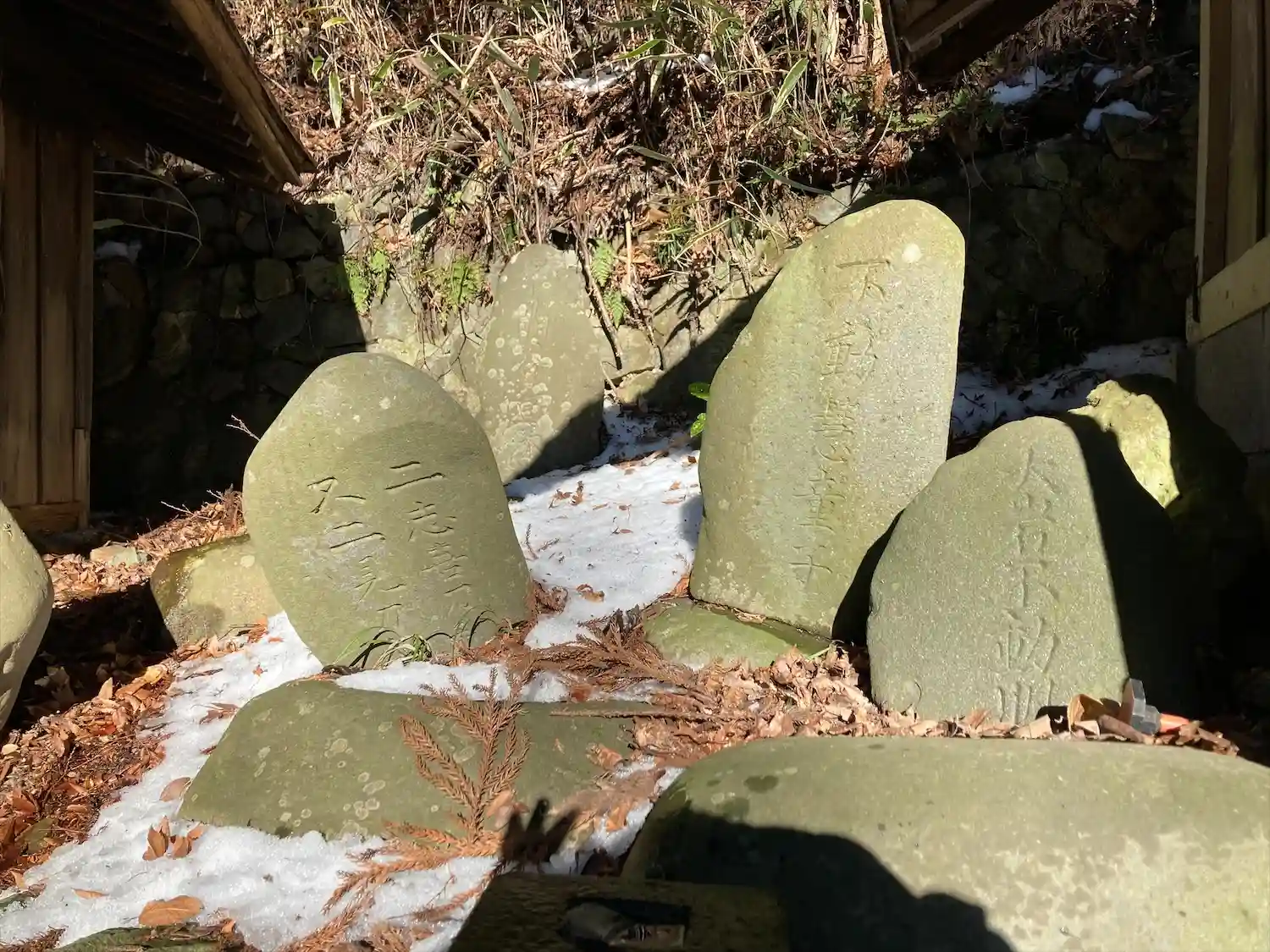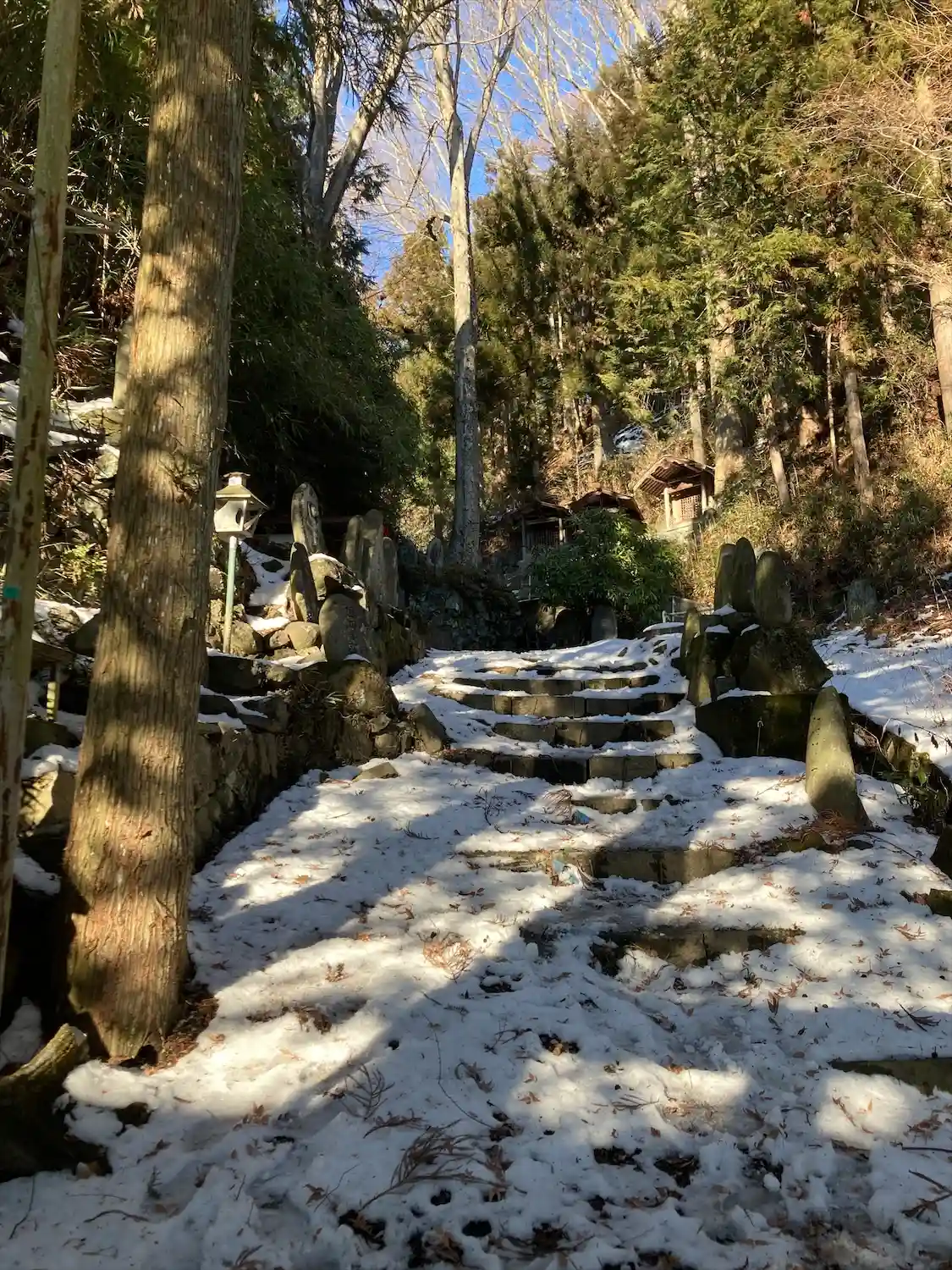 諏訪大社下社秋宮から北に750メートル行った津島神社の道を挟んで東側に位置する大岩不動尊は、入り口左に高尾穂見之宮があり、鳥居⛩️をくぐった左側に御射響稲荷神社があり、渓谷の坂道に沿ってびっしりと霊神、石碑、祠、石仏が並んでいます。参道は残雪で滑りましたが、頂上まで登るとニ山社、駒岳社、御嶽社の三社が祀られていました。一帯を総じて大岩不動尊と呼ばれています。