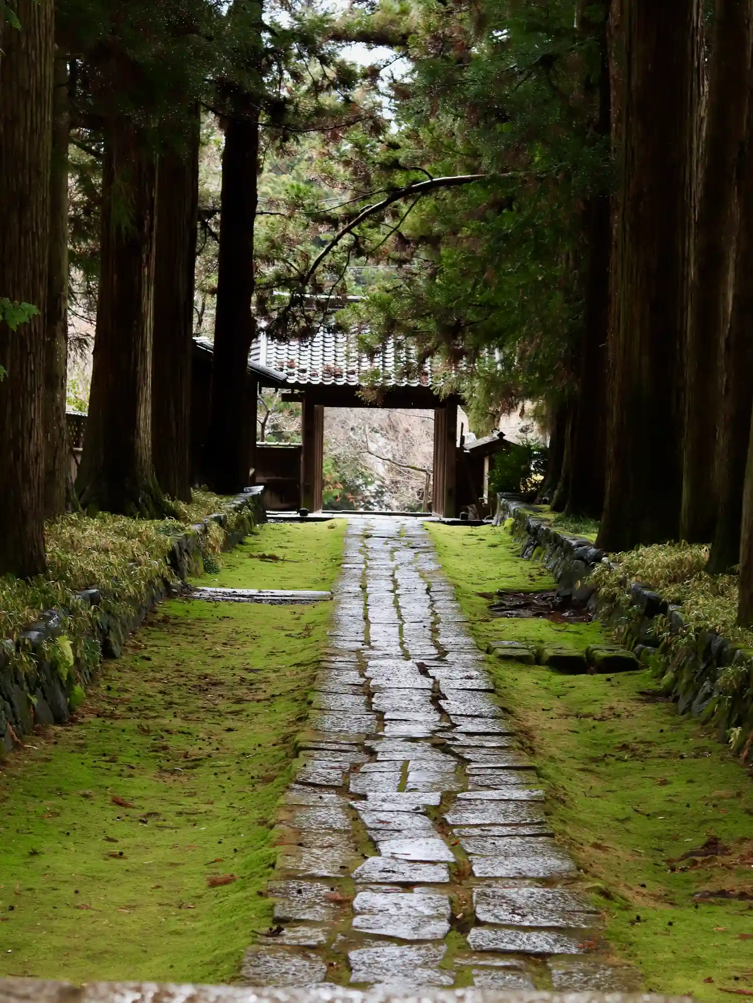 仁王門に向かって見事な杉並木と苔むした石畳