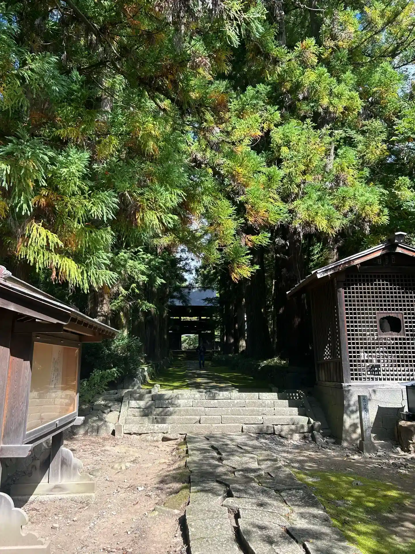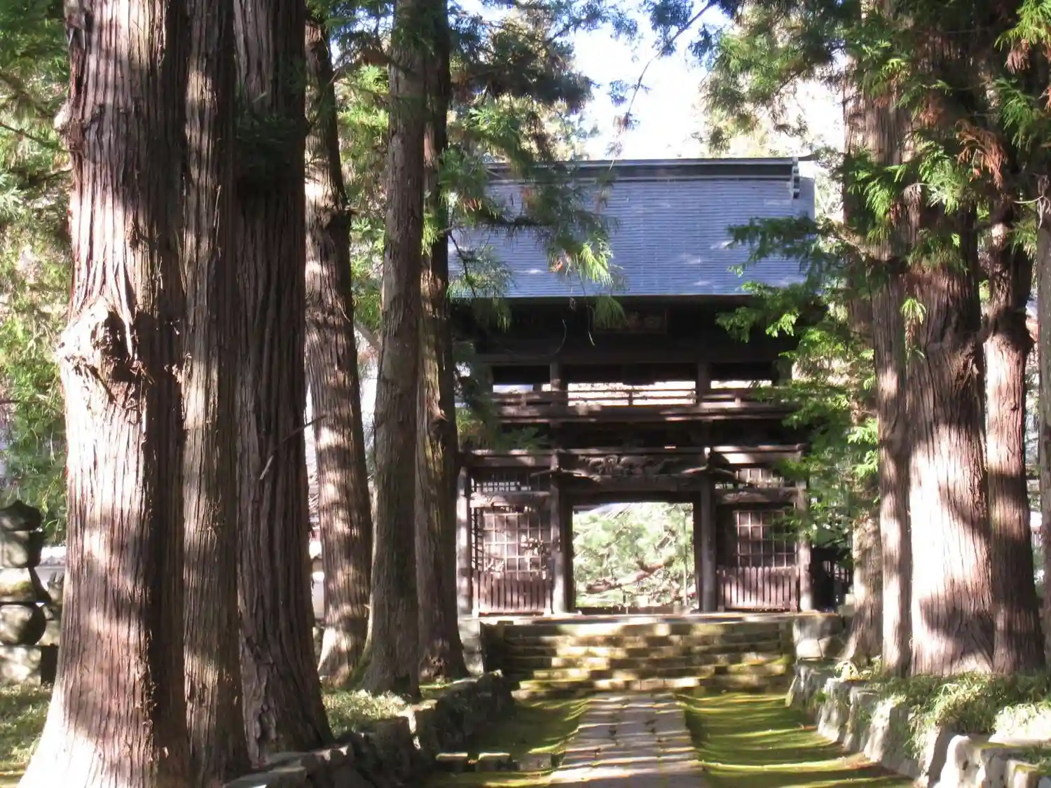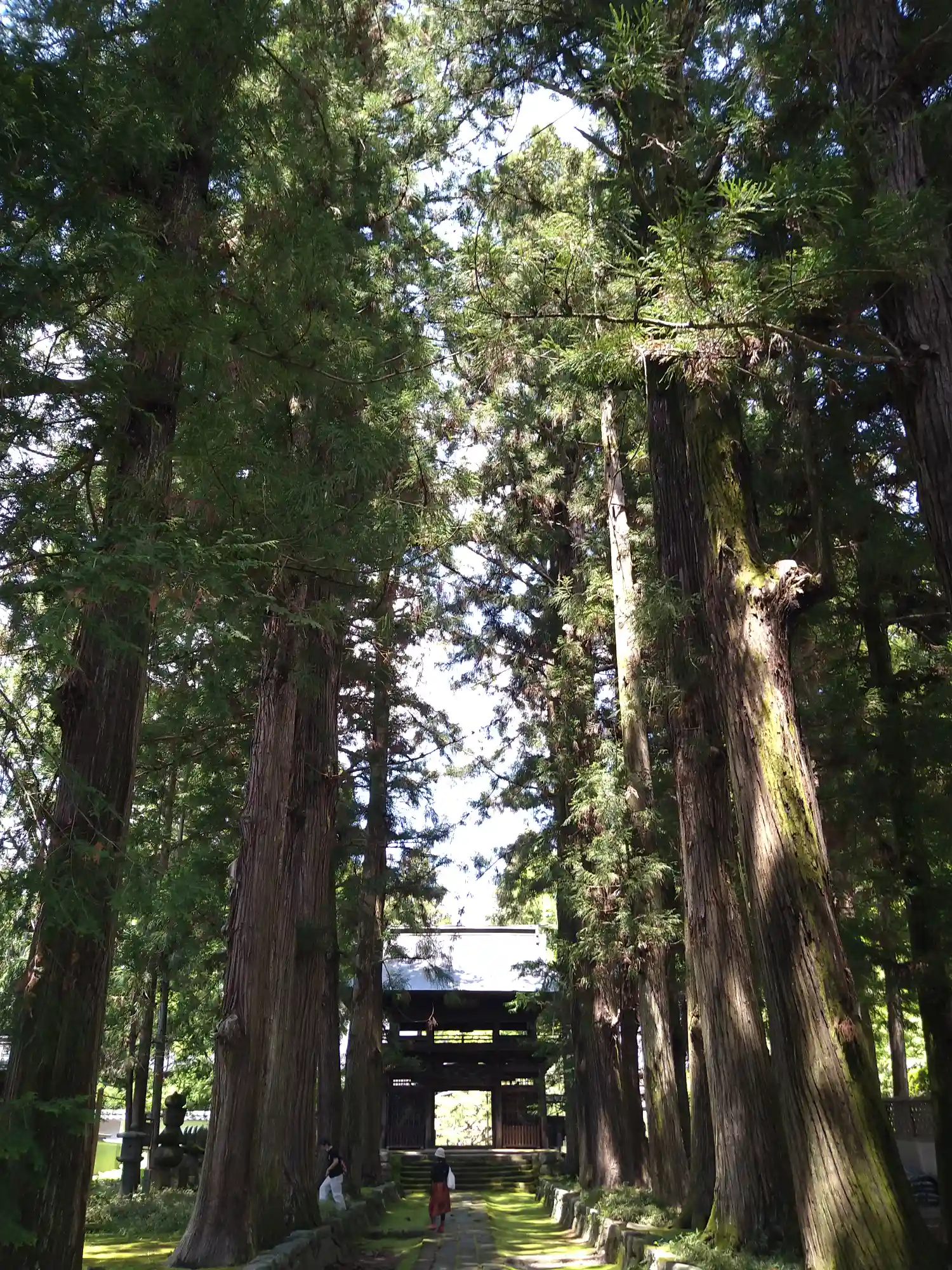 仁王門に向かって見事な杉並木と苔むした石畳