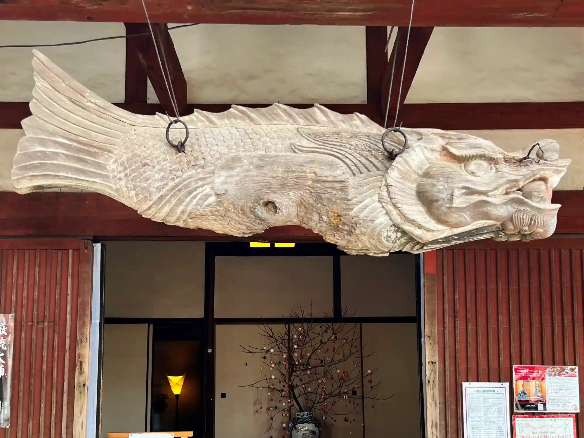 庫裏の入口に吊り下げてある<魚板>。寺院の衆に飯時などを告げた江南の鱖魚(けつぎょ)の魚鼓。こちらは日本に唯一残る明朝のものとのこと。