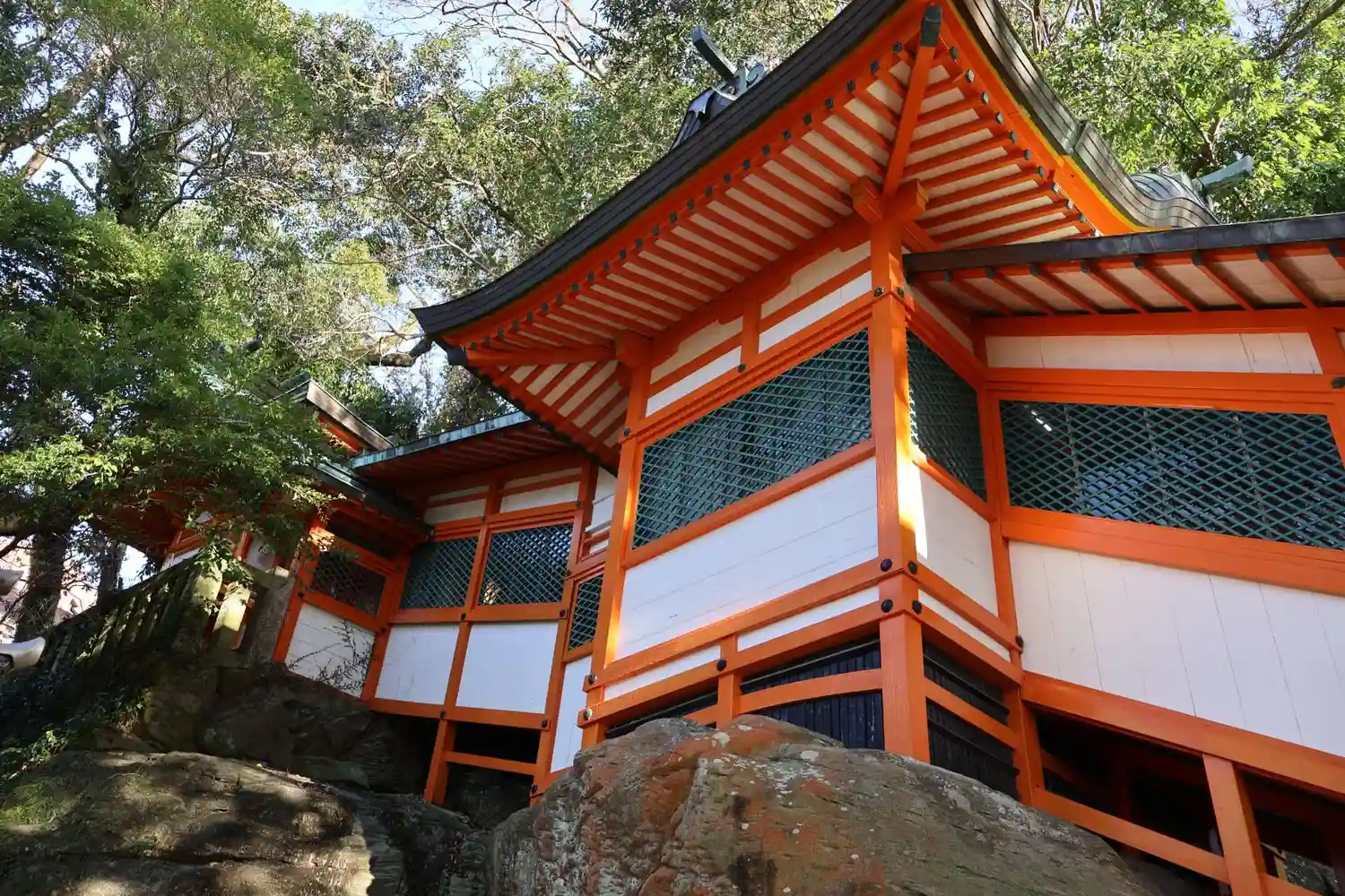 当社は、長崎電気軌道・新大工町駅の南南東400mの丘陵地帯のわりと急な傾斜地にある。カーナビに従い社殿近くにアクセスすると、当社近くではと急峻な細道を進むことになる(北側の麓からだと、おそらく相当な段数の階段を登ることになる)。社殿周りは特別広いわけではないが、境内社などが多く建ち並び、じっくり見て廻るべきものが多い。建物を建てるには好立地ではないが、その分、コストと手間がかかった昔からの篤い信仰を感じることができる。