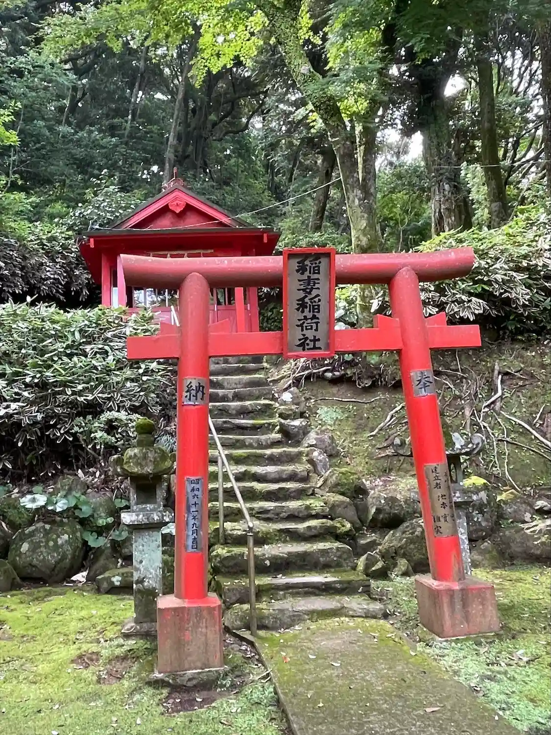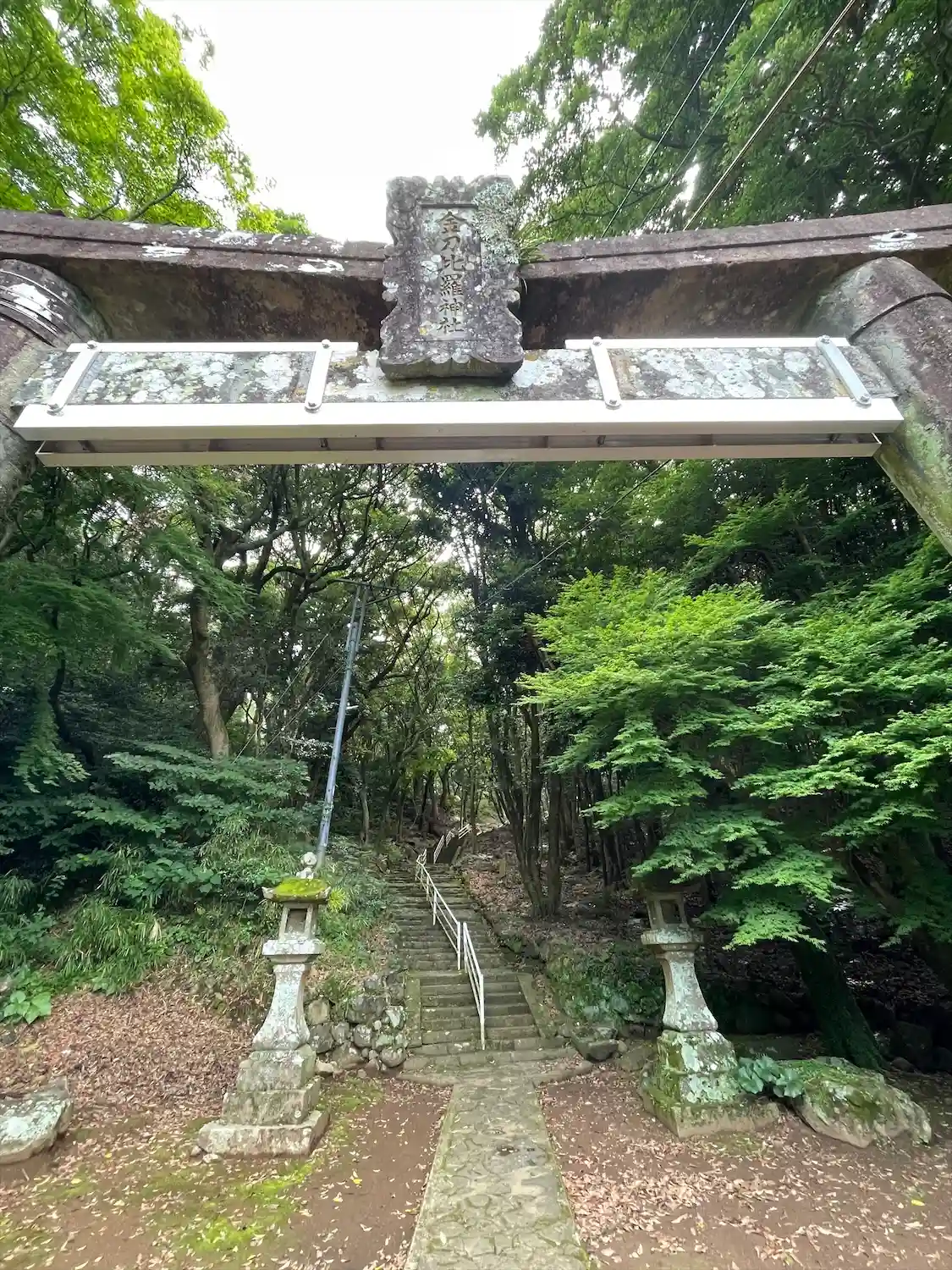 in長崎Ⅲ 2社目は金刀比羅神社⛩️です。 一ノ鳥居から山に向かってかなり15分?くらいでしょうか?歩きます。 車は一ノ鳥居の下の立山公園に置いて歩く🚶♀️ 歩く🚶♀️ 更に歩く🚶 暑いです。 汗💦かきます。タオルと水と女性は日傘が必要です。 妻は日傘を忘れ、ずっと日傘、日傘とぶつぶつ悔やんでました😅 参道は二つあり、階段と林道? 林道の方が木陰なんでそちらがお勧めですが林道入り口までの道路は現在道路工事👷♀️中。 完成後に林道入り口にパーキング🅿️を作っていただくとかなり早く到着します。
