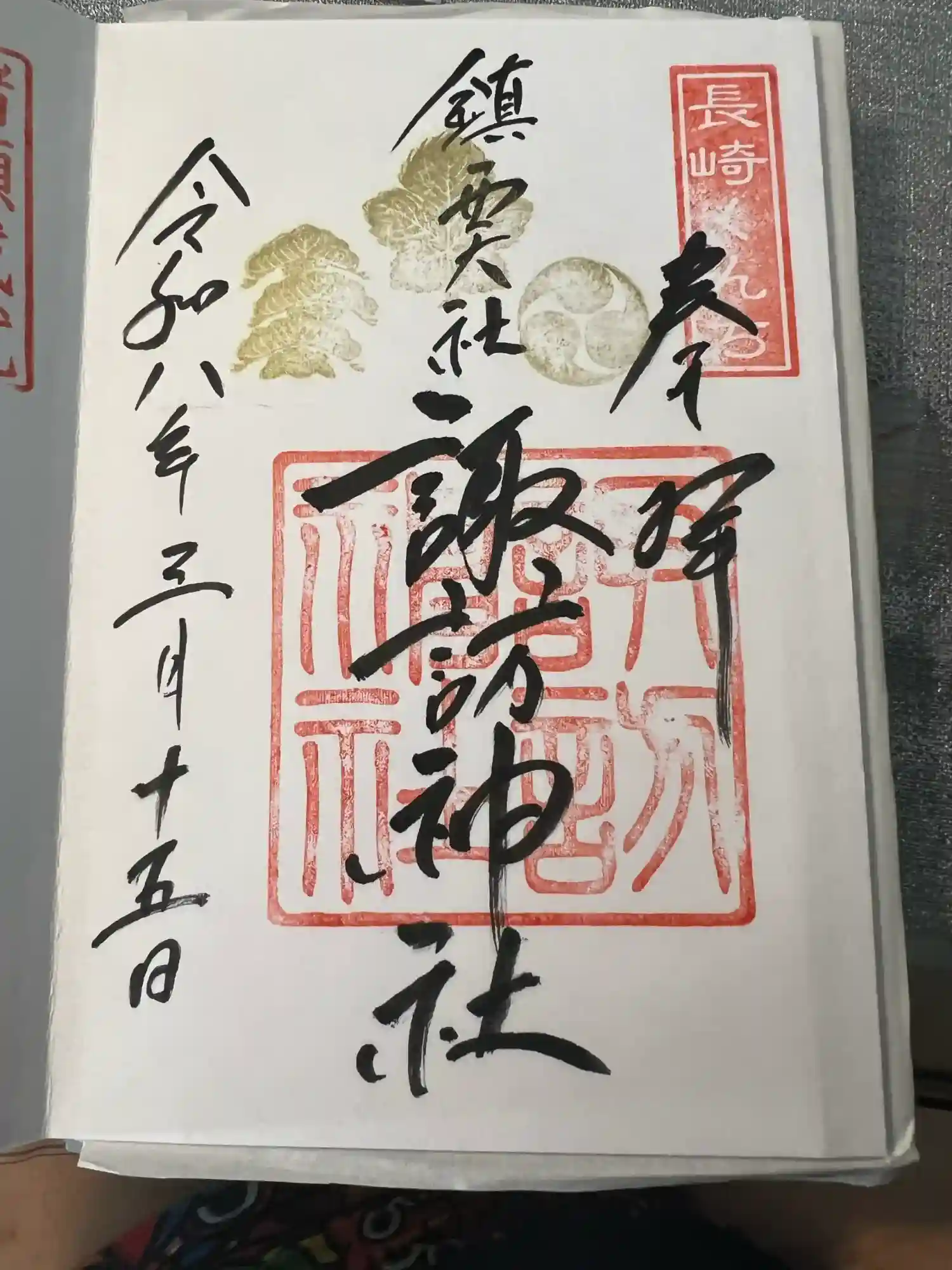 | 御朱印 | あり 真ん中に鎮西大社諏訪神社と書かれ、右上に長崎くんちの印、真ん中に御神紋の印、諏訪神社の社印が押されています。