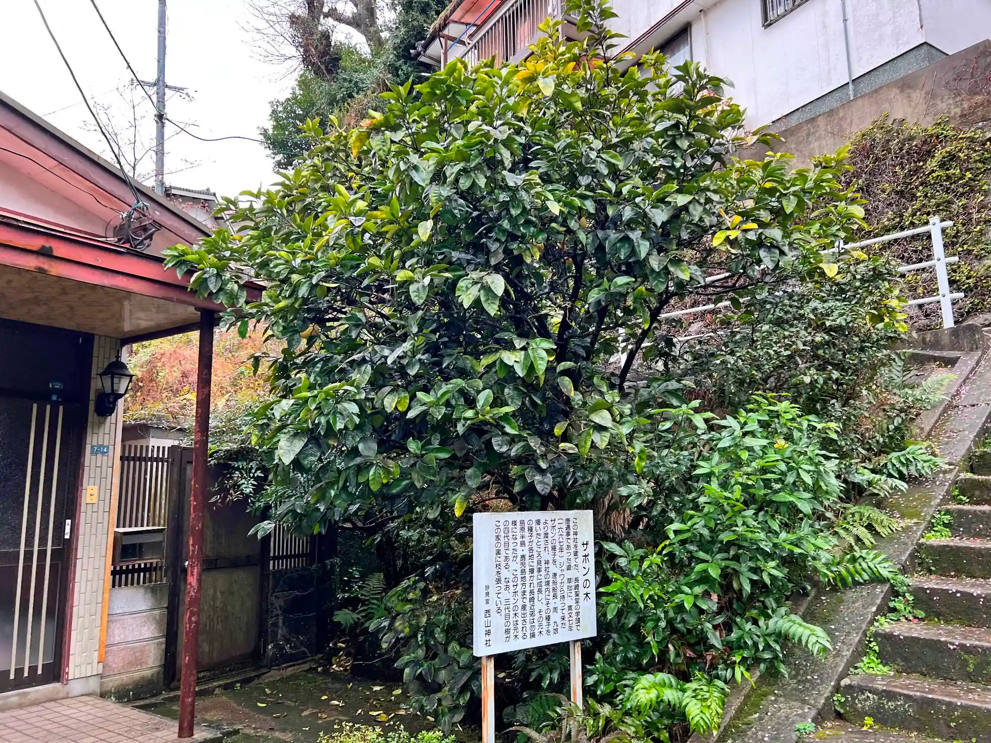 階段左脇の<ザボンの木>。江戸時代前期1667年に唐船船長・周九娘がジャワから持って来たザボンの趣旨を唐通事(通訳)・盧草拙に渡して当社境内に植えたとのこと。この木自体は三代目とのこと。