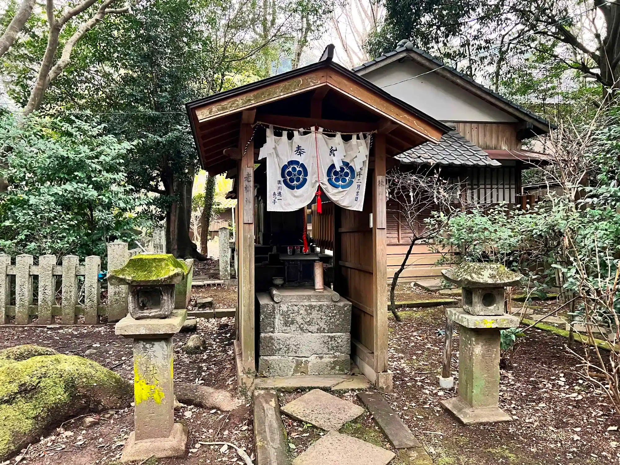 御神木の近くにある境内社。「老松神社」と「猿田彦神社」の2つの表札が掛かっている。