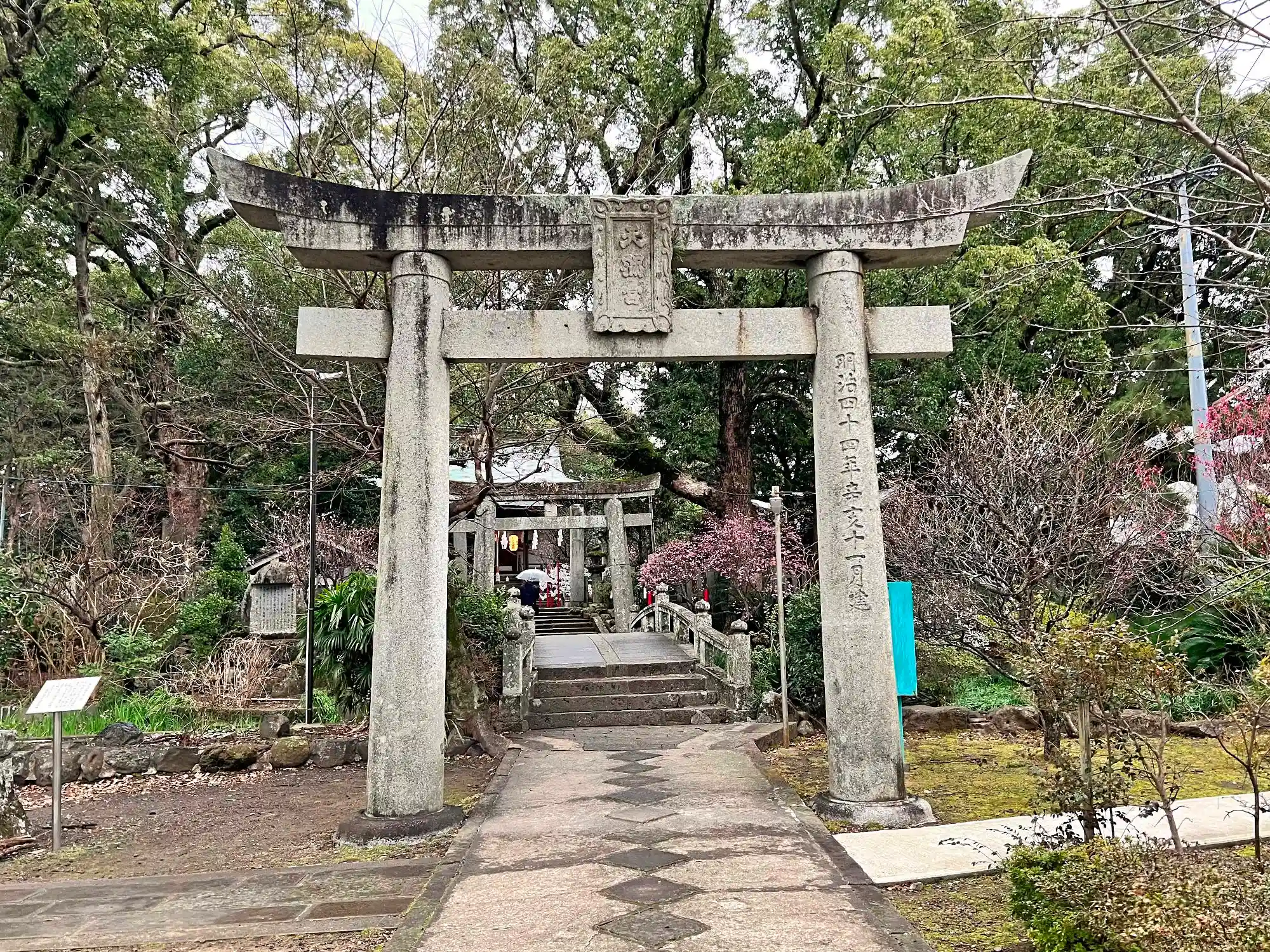 参道を進んで<一の鳥居>。明治末期の1911年の建立。石扁額には「天満宮」の文字。