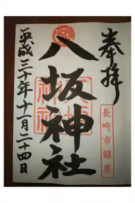 真ん中に大きく八坂神社と書かれ、右下に長崎鎮座の印、真ん中に御神紋と八坂神社の社印が押されています。 | |||