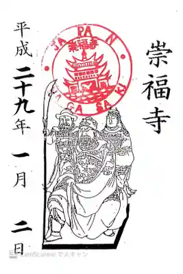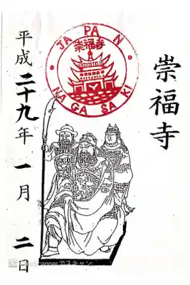 右に崇福寺と書かれ、真ん中にJAPAN NAGASAKI 崇福寺の印、関羽・関平・周倉の像のイラストの印が押されています。