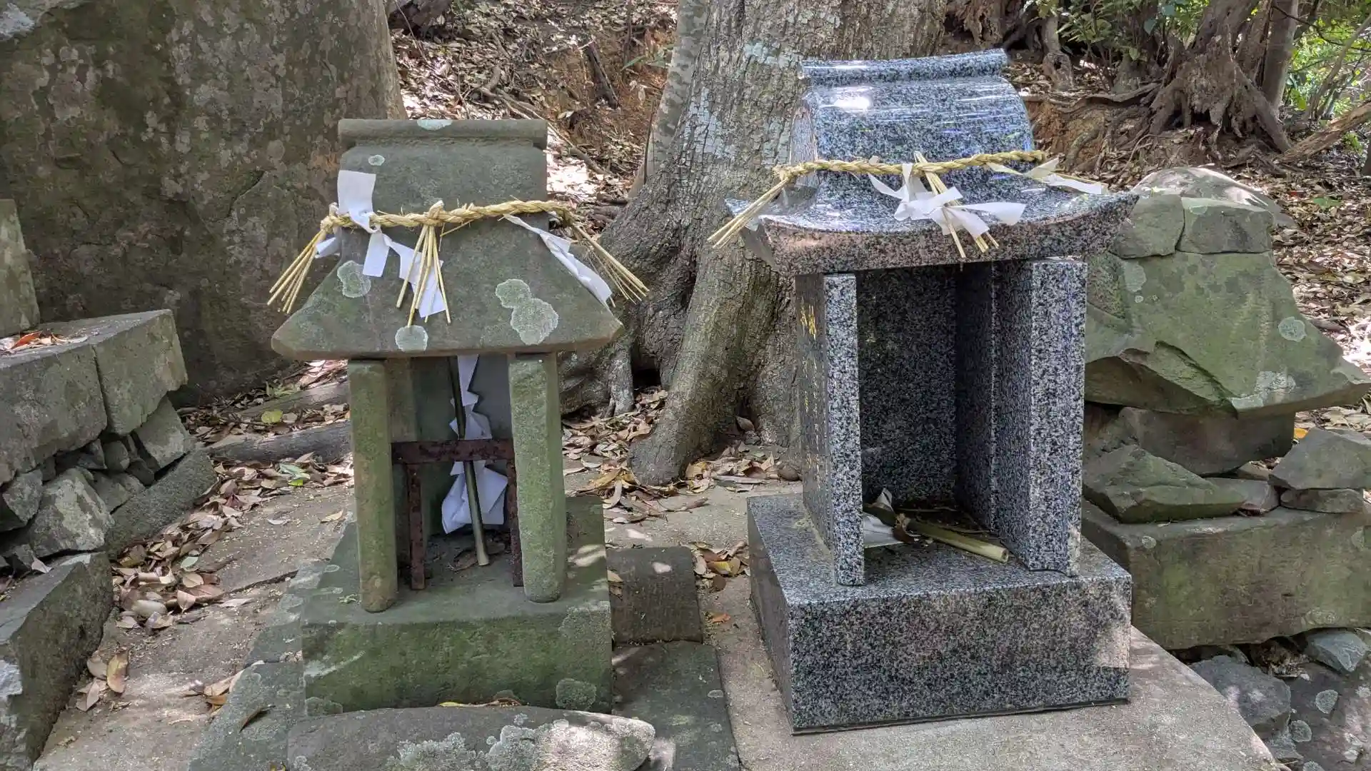 黒島神社参拝後に寄りました。すぐ隣にありますが末社かどうかは不明。黒島神社とは別に参道と鳥居があり鳥居の傍には恵比寿様が祀られていました。祠は大正時代に建てられた物で5社並んでいます。見た感じ新しい物もあるので段々と増えていったんだと思います。特に目を引くのが祠の後ろにある御神体と思われる大岩。祠が建てられる以前からあるもので古代からの磐座信仰の名残りだと説明板に書いてありました。隠れキリシタンで有名な黒島にも日本古来の神様が息づいていました。