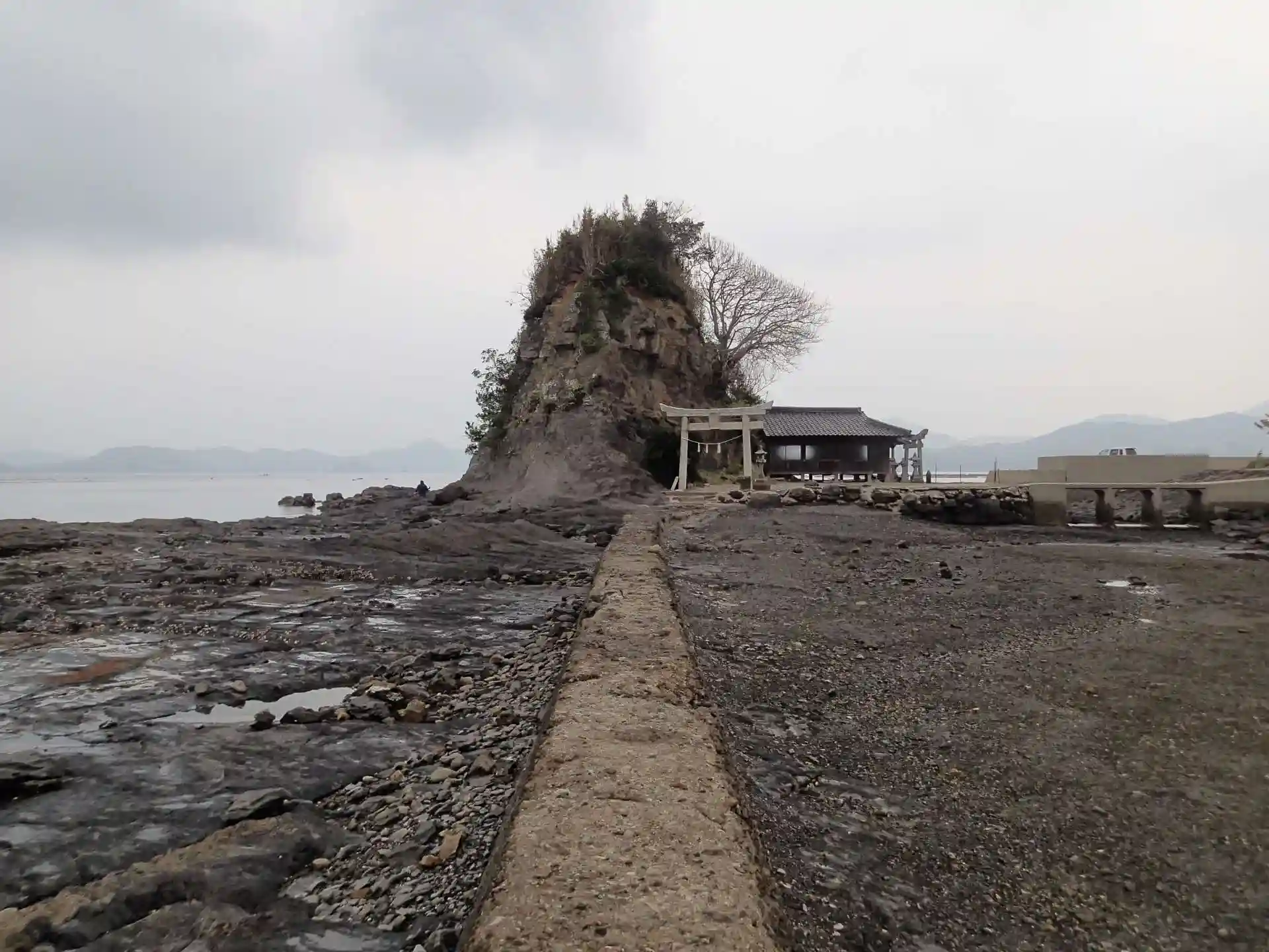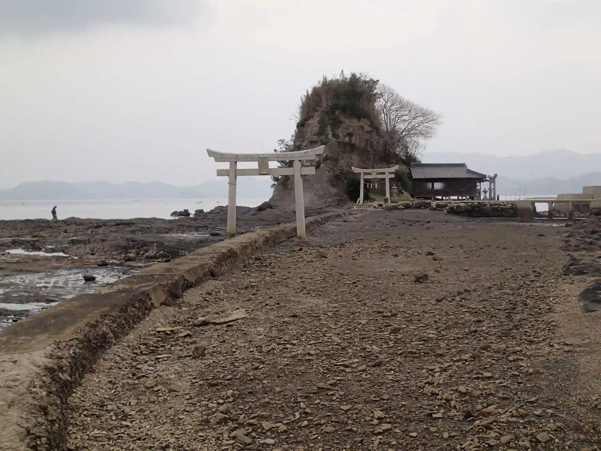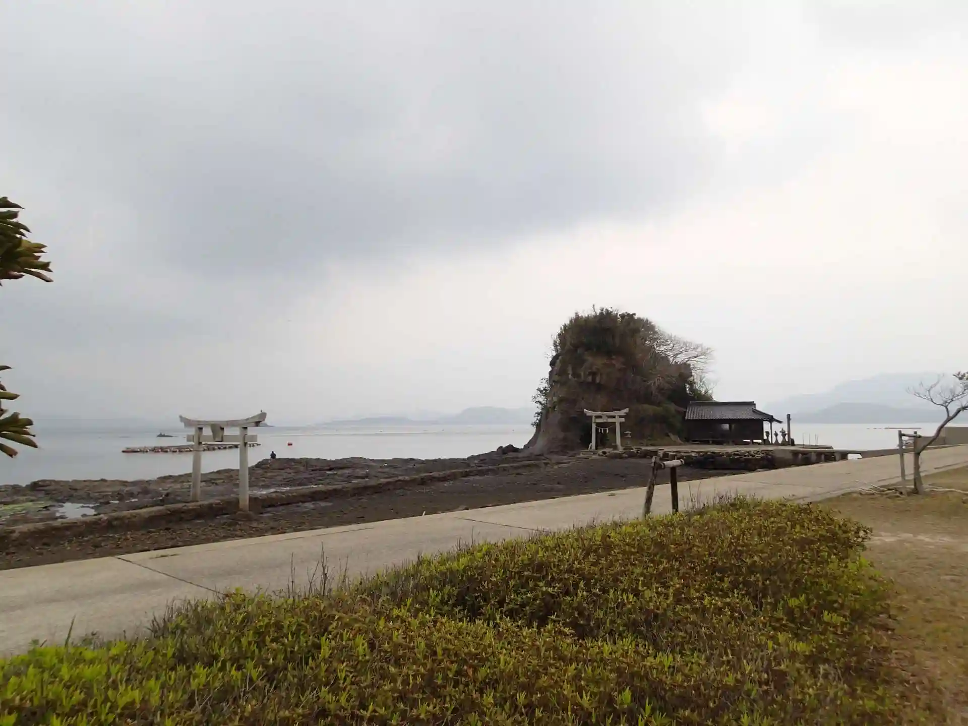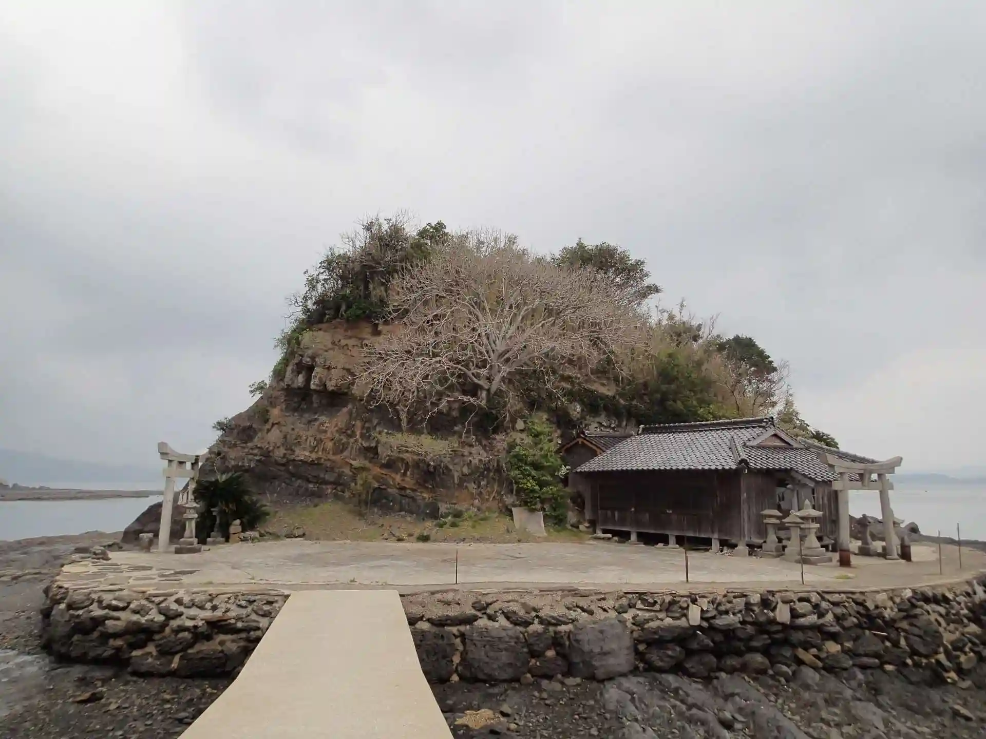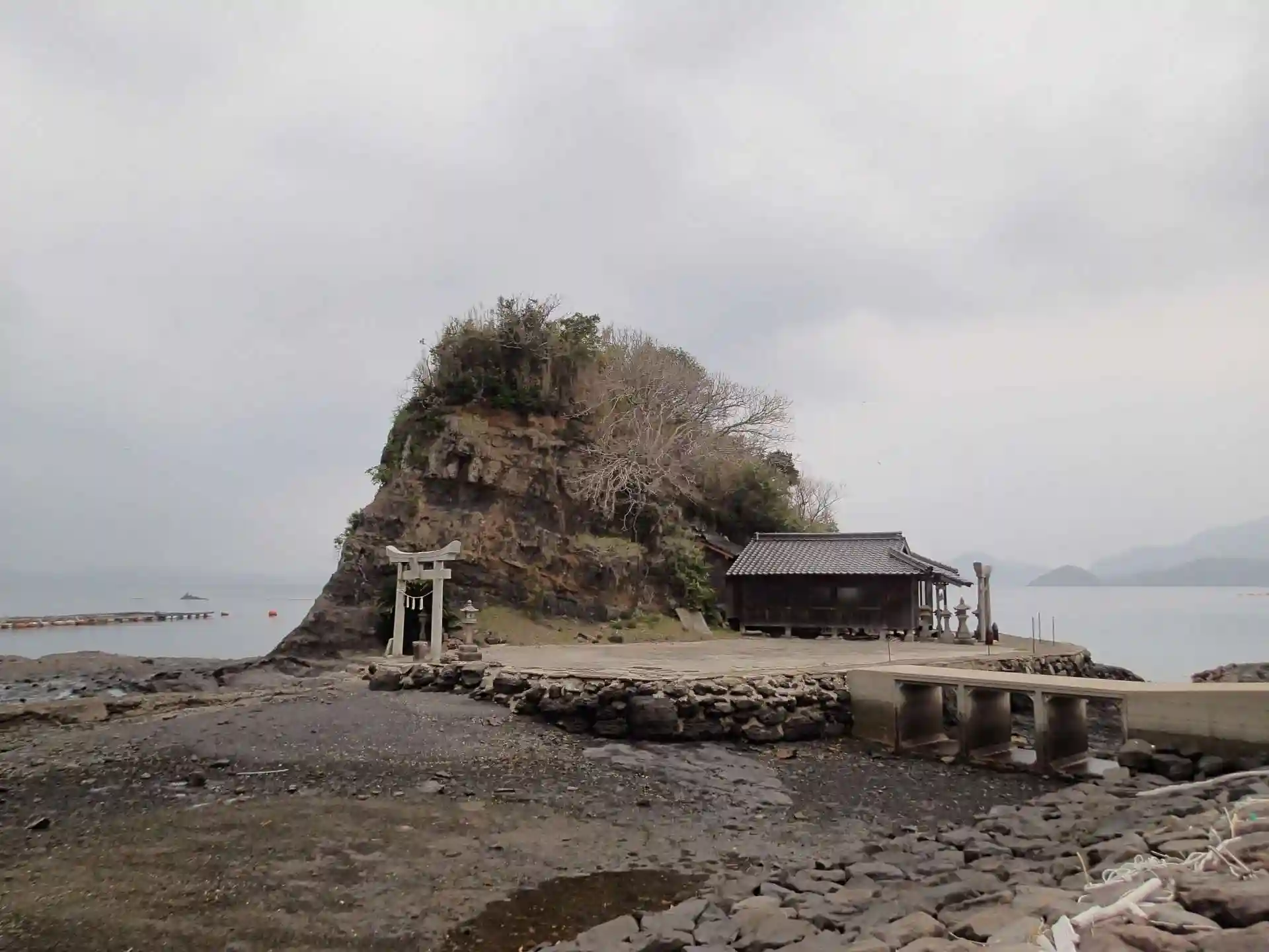 海岸沿いの小島に、大岩を背にして鎮座されています。