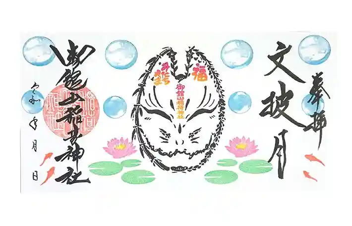 文字絵の狐面に睡蓮、金魚、シャボン玉のハンコを押した三面御朱印です。