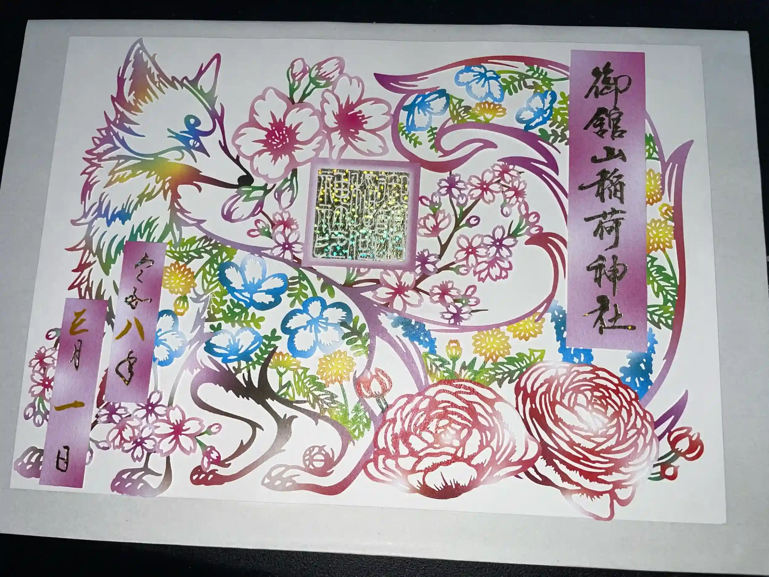 ステキなお狐さまの切り絵御朱印です。