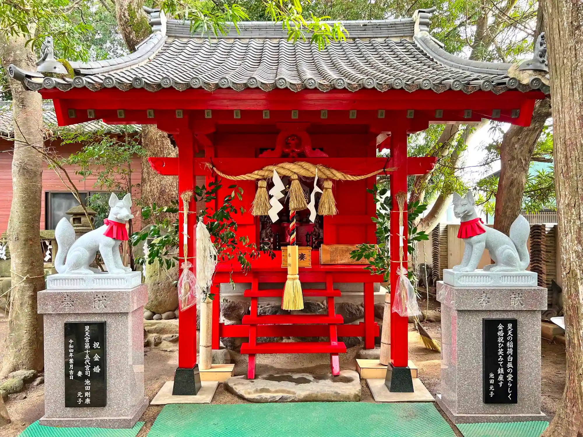階段を登っていくつか赤い鳥居をくぐったところにある祠。「幸天大明神」と刻まれた石製扁額が2つ置いてある。