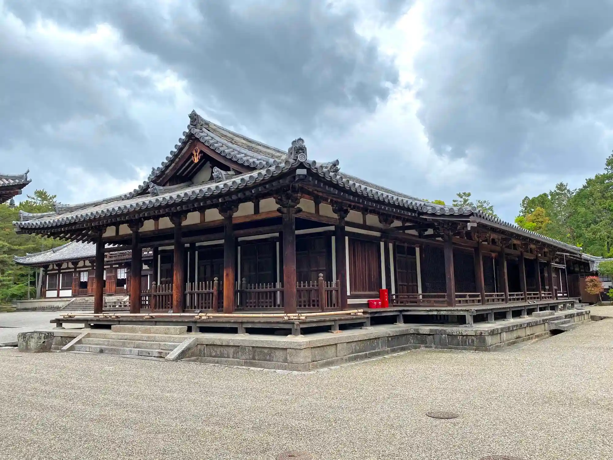 <金堂>の真裏に並行して建つ、国宝<講堂>。奈良時代建立、入母屋造、本瓦葺。平城京の東朝集殿(ひがしちょうしゅうでん)を移築・改造したもの。