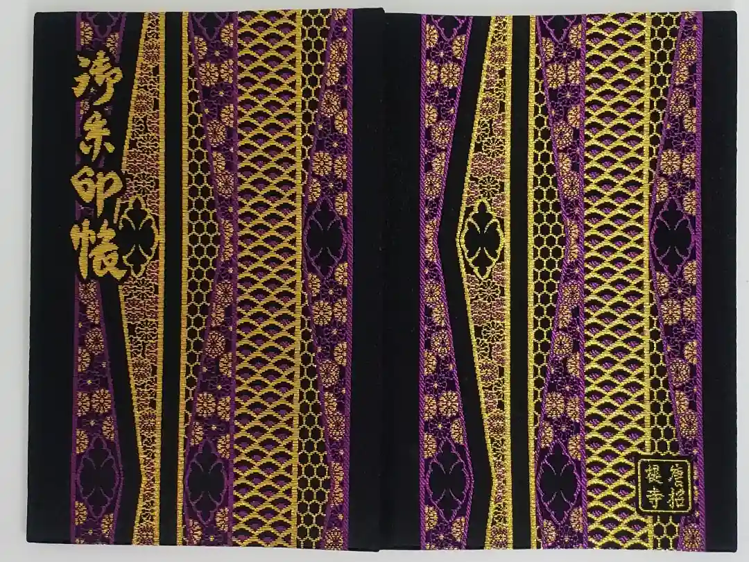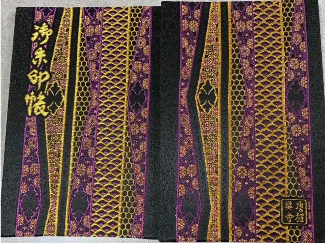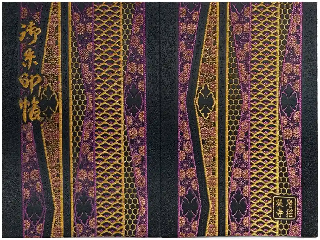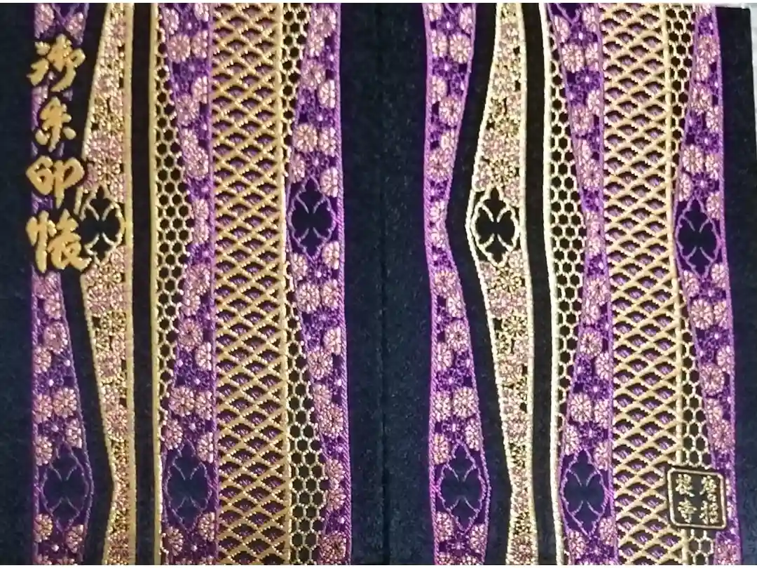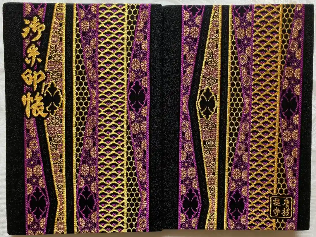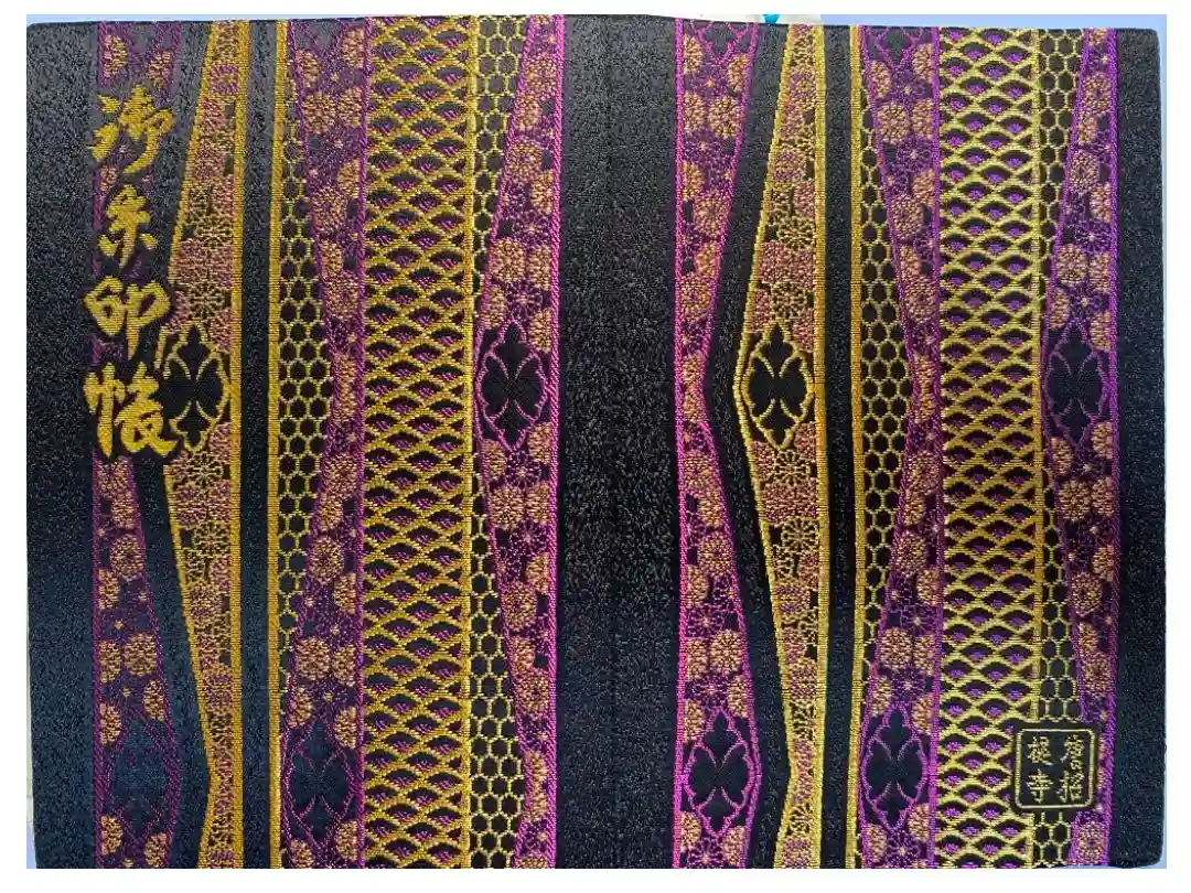 地に方円彩糸花網(ほうえんさいしかもう)が敷かれ、表面の左上に御朱印帳、裏面の右下に四角の中に唐招提寺と入っています。