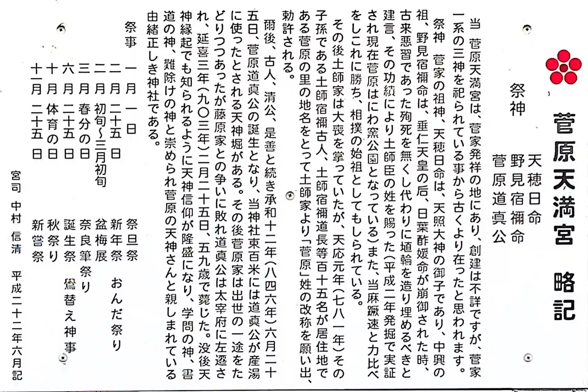 その中にあって、菅原家発祥及び生誕の地である菅原天満宮と、終焉の地である太宰府天満宮及び京都の北野天満宮は最も重要な神社とされています。