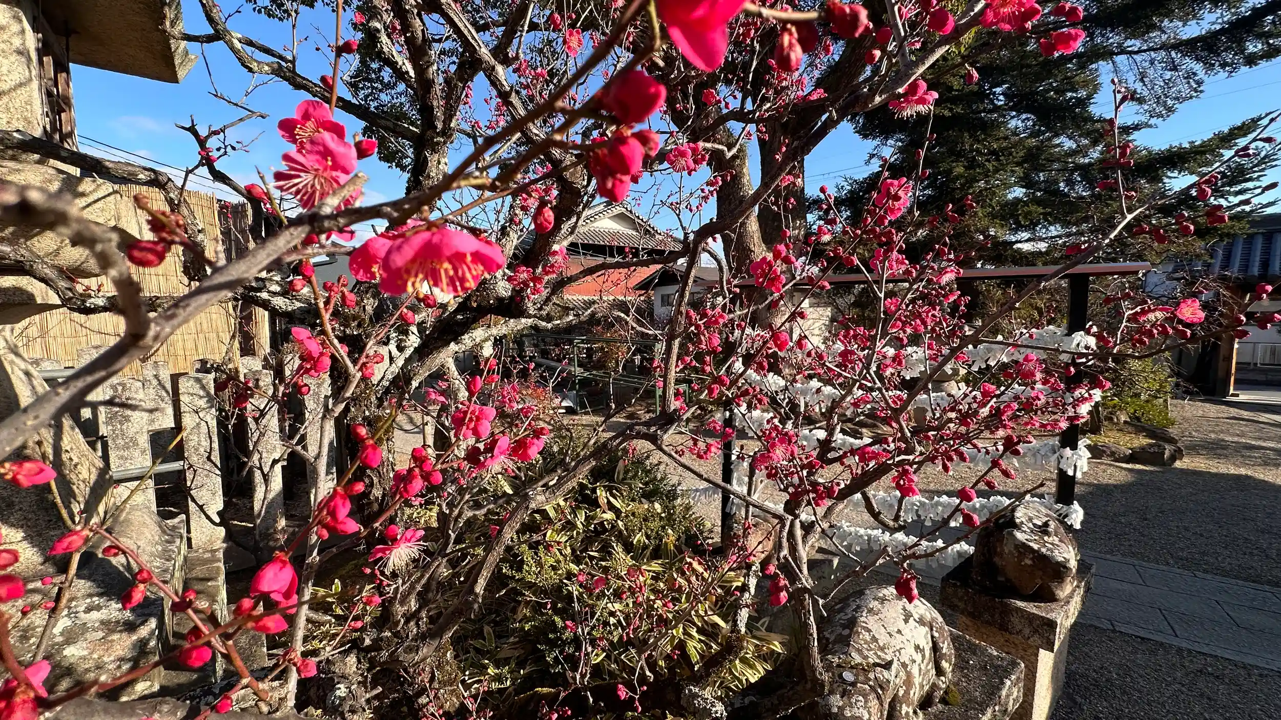 濃い色の紅梅の花が咲き始めています。2024年2月4日から3月3日まで盆梅展が行われるようです