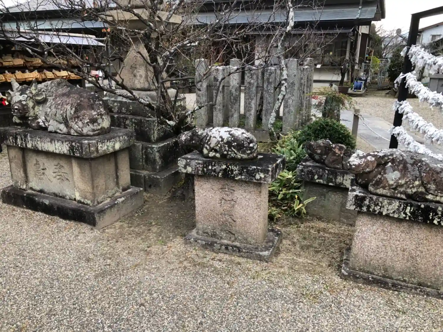 盆梅が有名ですが、今は梅が実をつけていてあちこちにある牛さんに置かれてました。こじんまりした境内で…