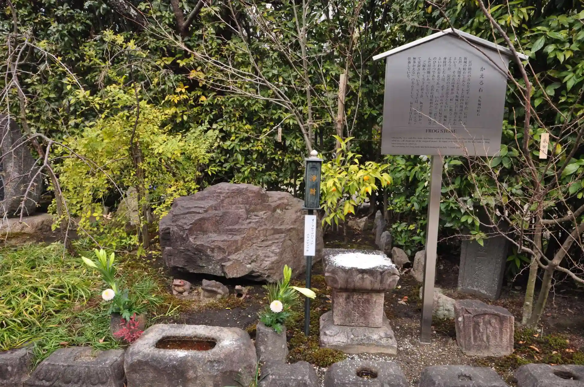 「大阪城の蛙石」。ご縁あって当寺に移され、極楽堂に向かって安置されている。「福かえる・無事かえる」の名石として、毎年7月7日に供養しています。