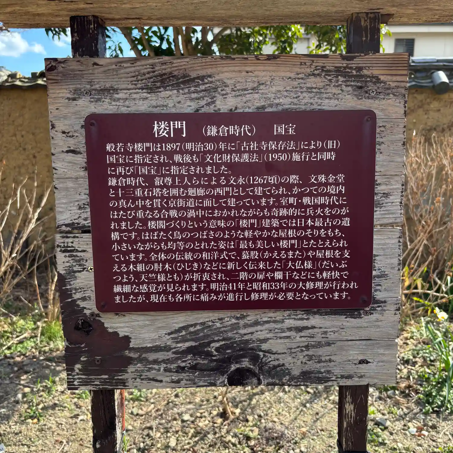 般若寺は飛鳥時代、高句麗の慧灌法師によって開かれた。都が奈良に遷って天平7年(735年)、聖武天皇が平城京の鬼門を守るため『大般若経』を塔の基壇に収め卒塔婆を建てられたのが寺名の起こりとされる。
