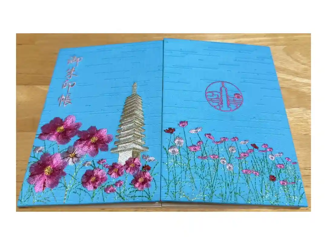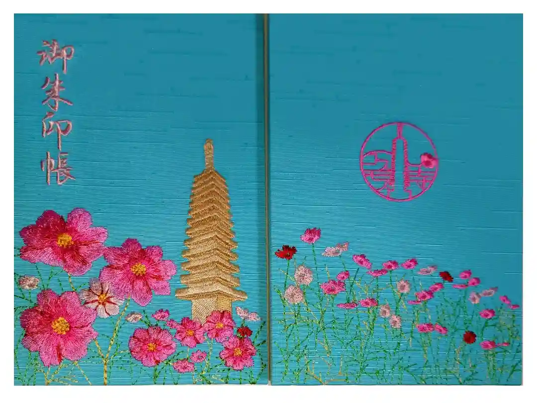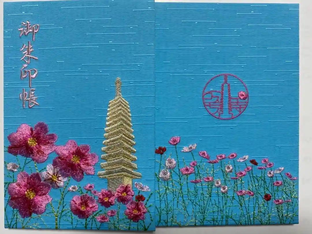 表も裏表紙にもコスモスの刺繍が施されて ホントにステキなご朱印帳で 一目惚れしていただきました😍