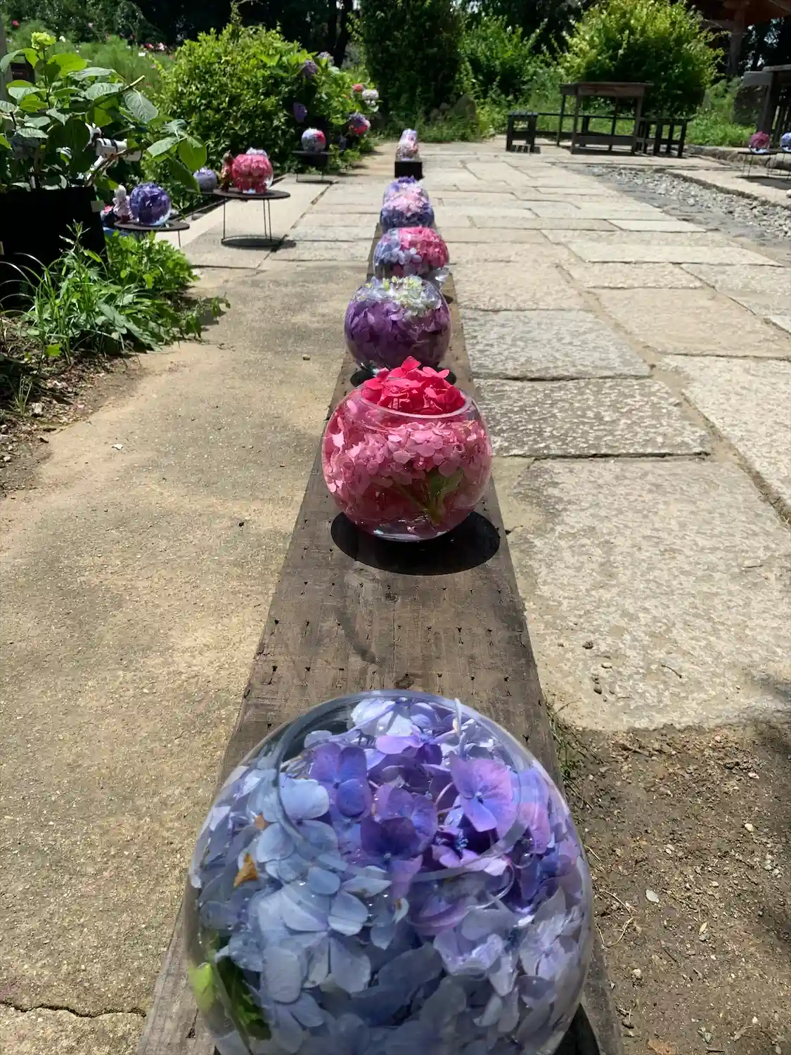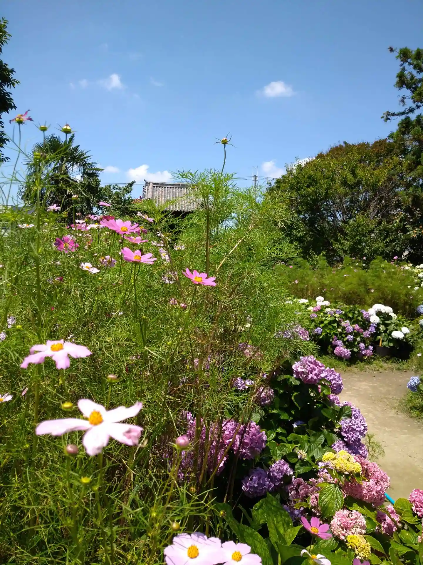 紫陽花とコスモスのコラボレーションが見られるお寺です。紫陽花のガラスボールも素敵でした。