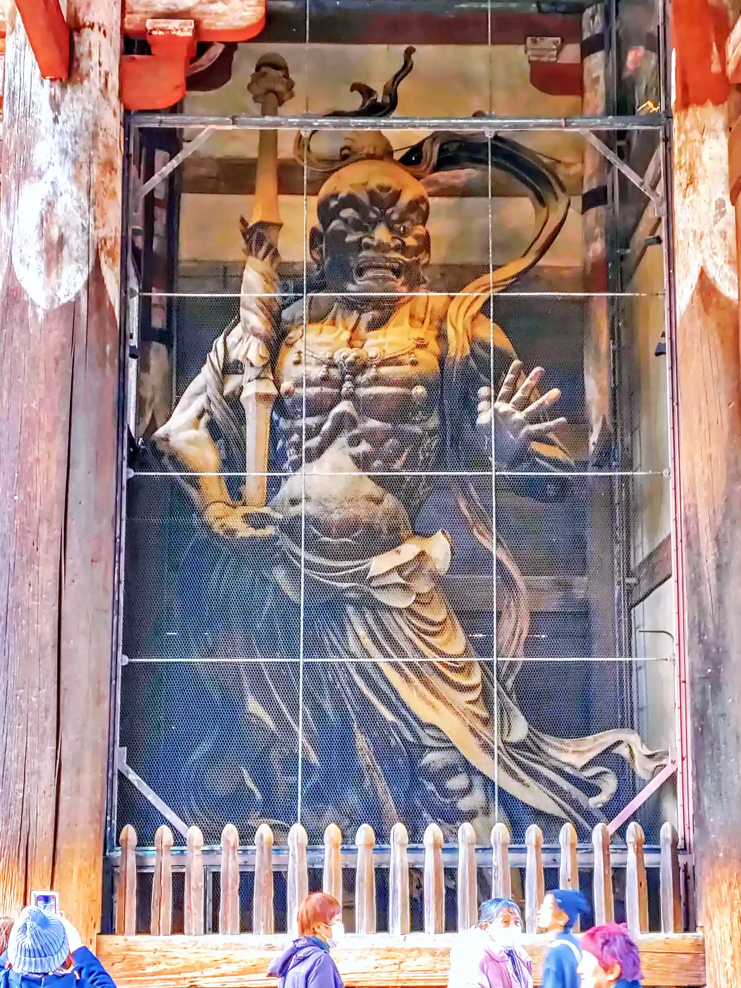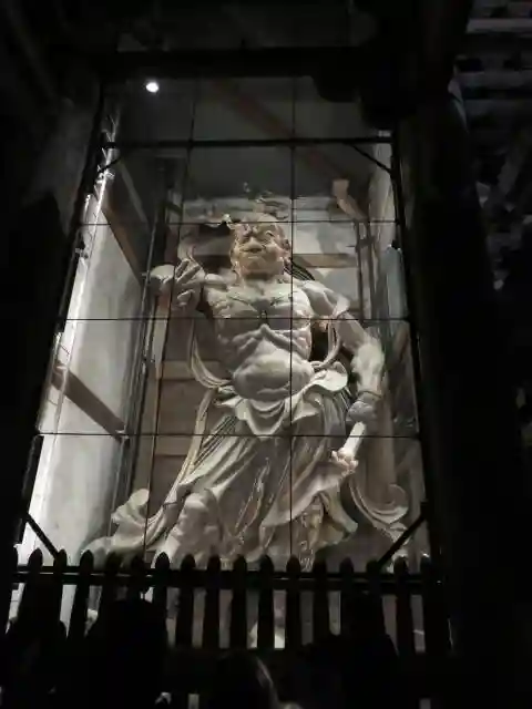 国宝<木造金剛力士像>の左側・阿形(あぎょう、口を開いた像)。金剛力士像は高さ8.4mの巨大な木像で、1203年に大仏師・運慶、快慶、湛慶、定覚がわずか69日で造立。阿形は吽形とは作風が異なり、快慶が主となって制作されたと言われる。