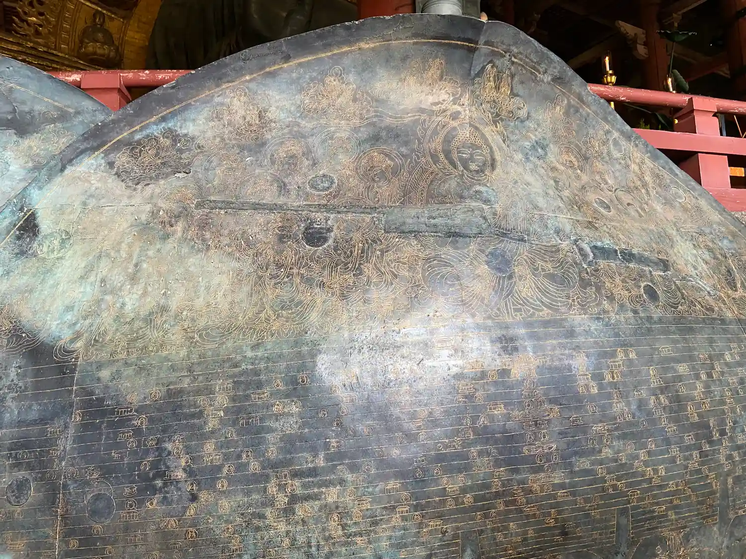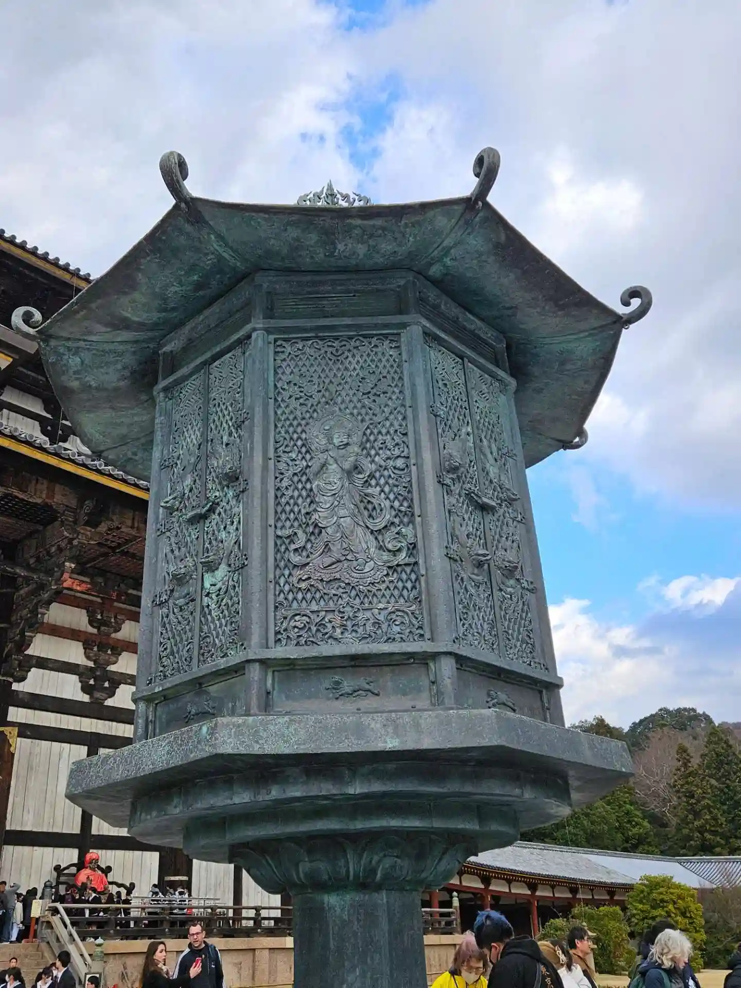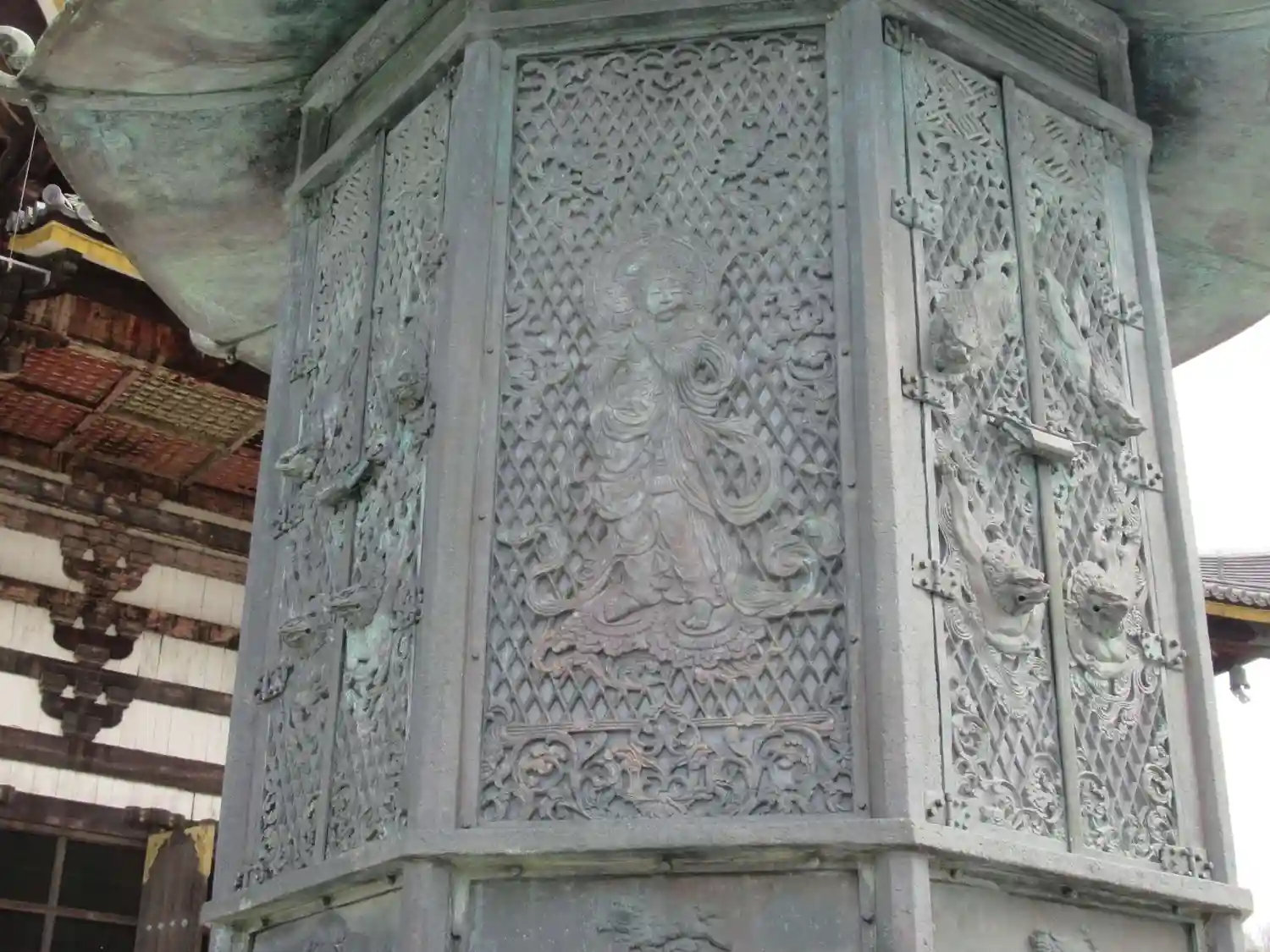 金銅八角燈籠。国宝。ほとんどの人がスルーしているが、これも立派な国宝。非常に精密な彫刻がびっしり。