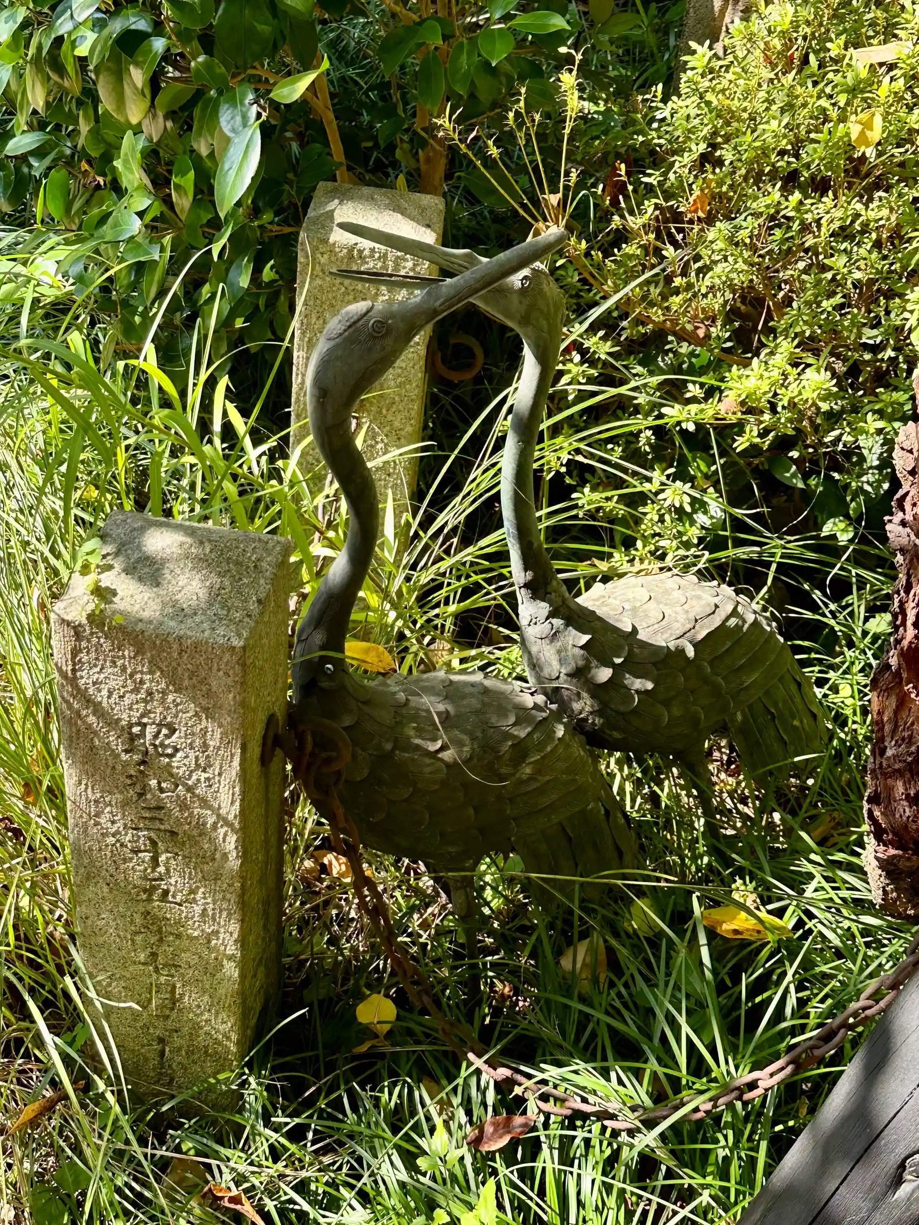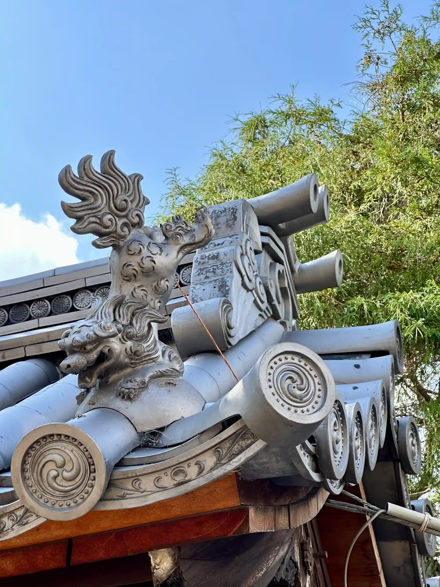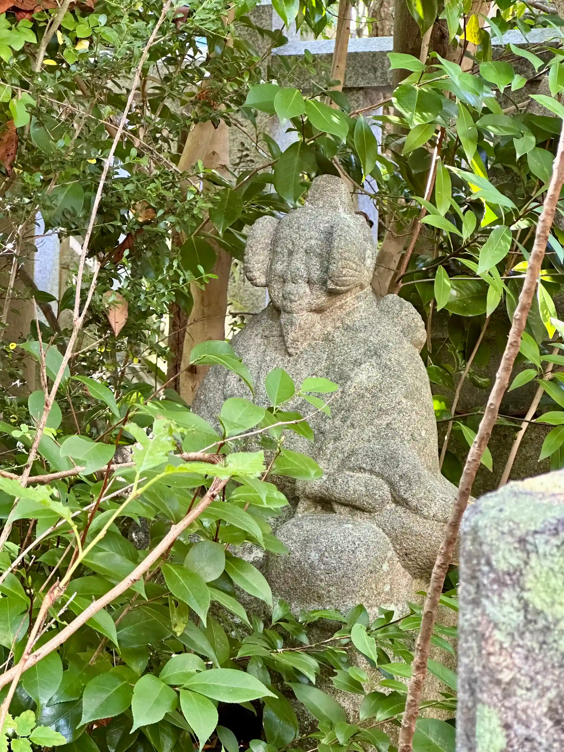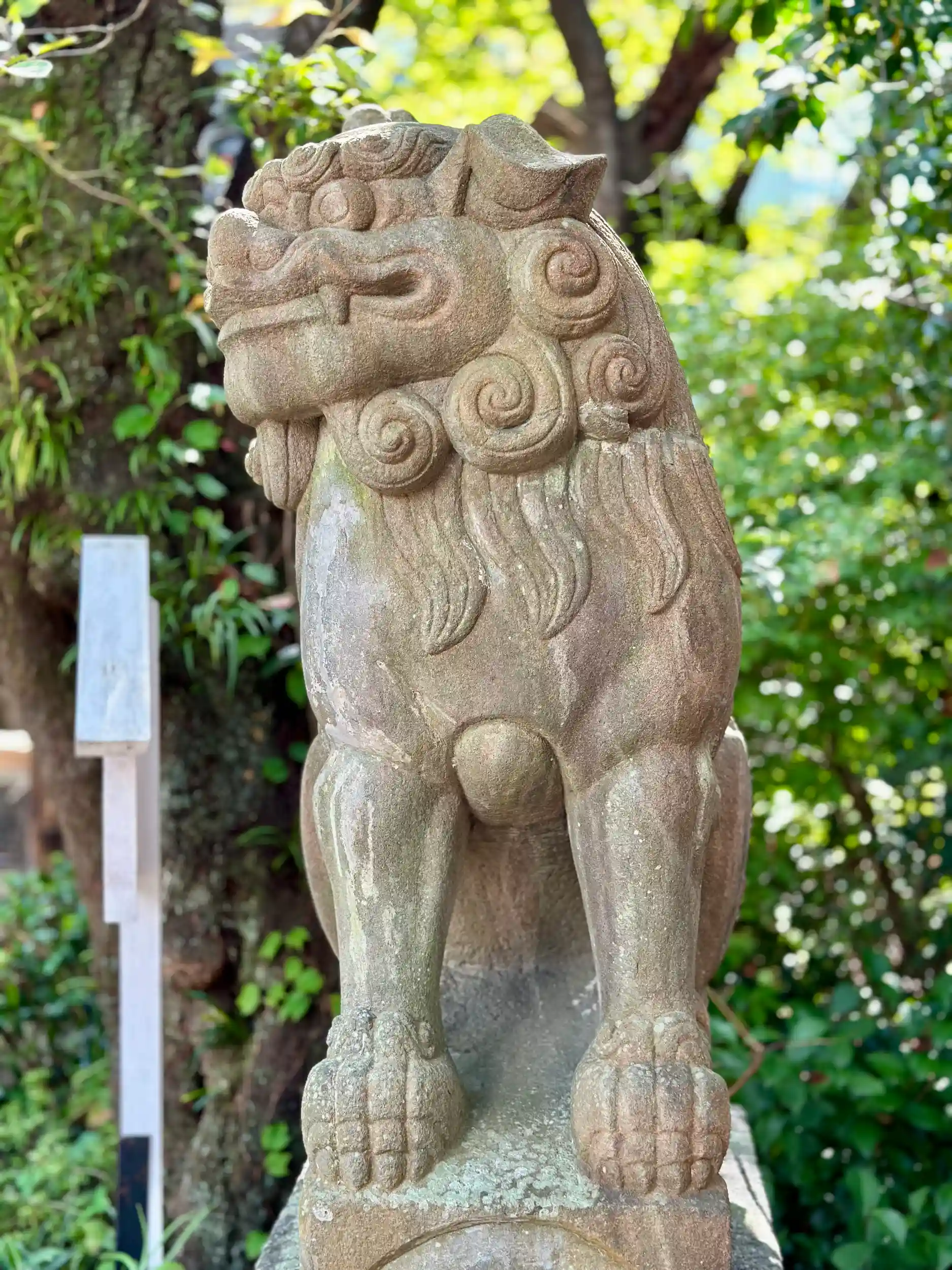 狛犬(こまいぬ)の後方に砂岩製の随身像(ずいじんぞう)が。屋外にあるのは珍しいです。
