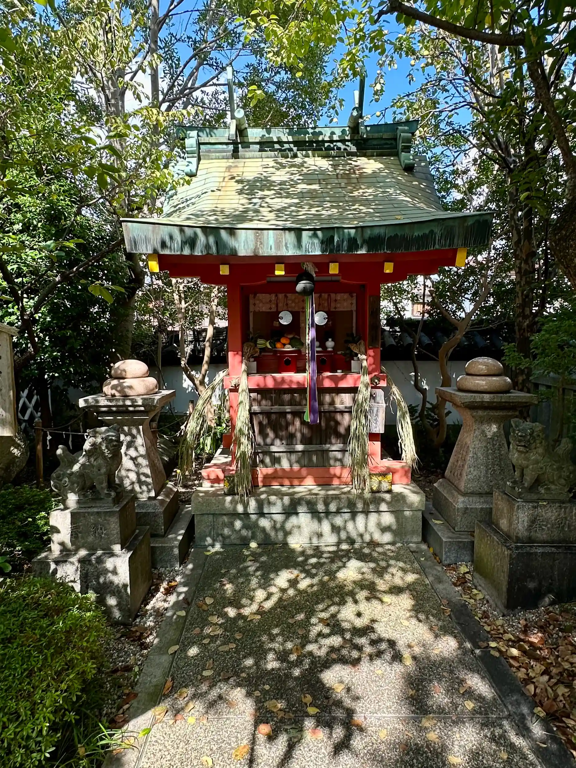 境内社の林神社(りんじんじゃ)は、お饅頭まんじゅうの神さまです。現在ではお菓子全般の神さまとしてご鎮座されていて、ご祭神の林浄因(りんじょういん)(南北朝時代に中国から来た禅僧)さまの命日である4月19日には「饅頭まつり」が行われて、ご神前に全国各地からの銘菓が献上されることを教わりました。