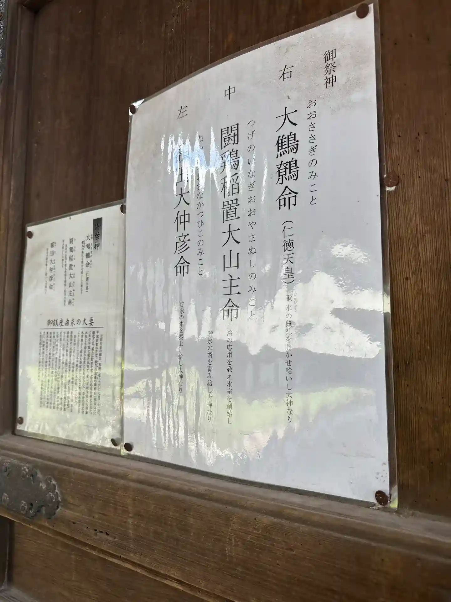 中央の闘鶏稲置大山主命さまは右側の大鷦鷯命(仁徳天皇)さまに氷を献じたと伝わります。