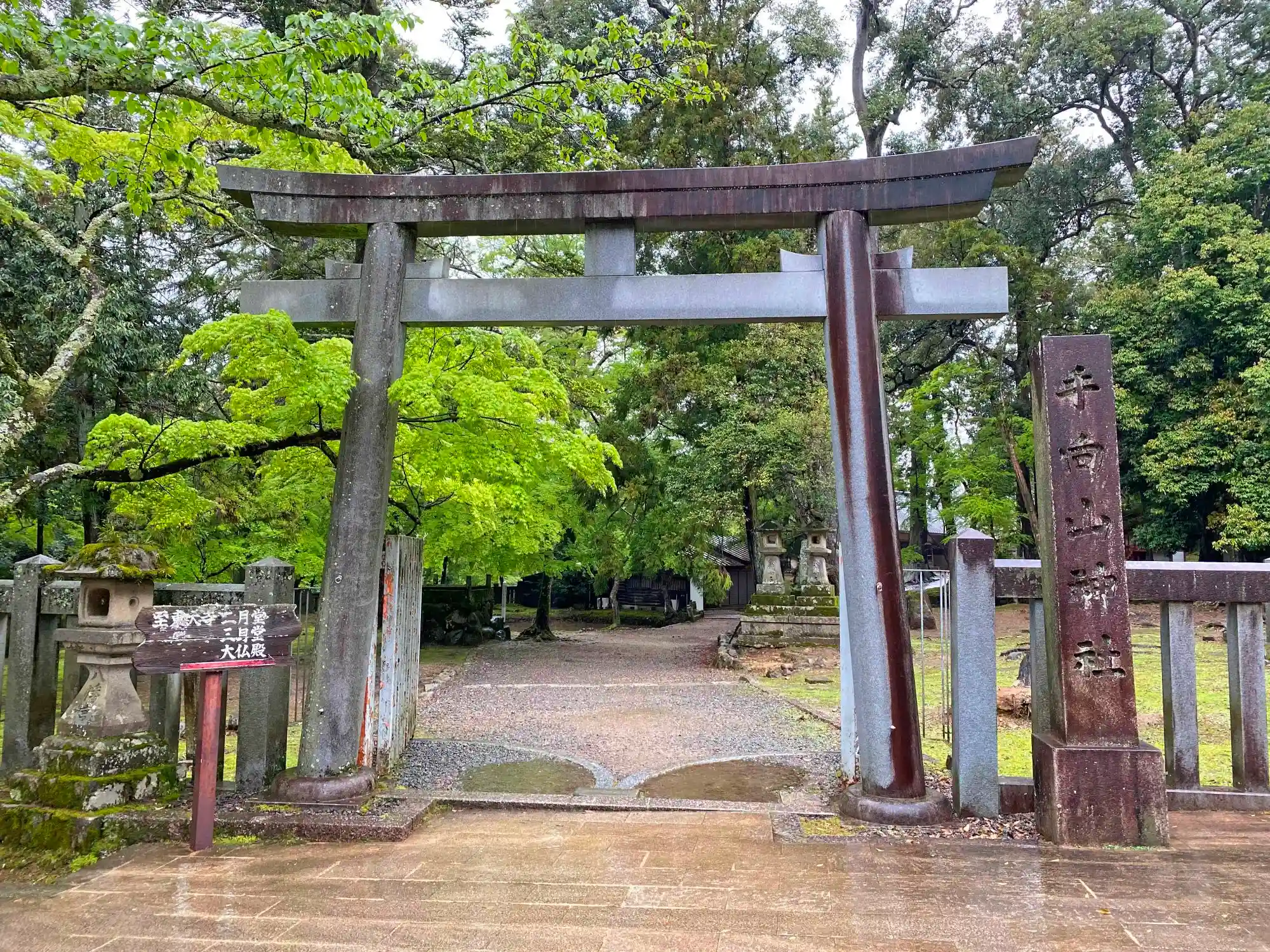 境内最北端にある鳥居と社号標。東大寺法華堂(三月堂)の近く。