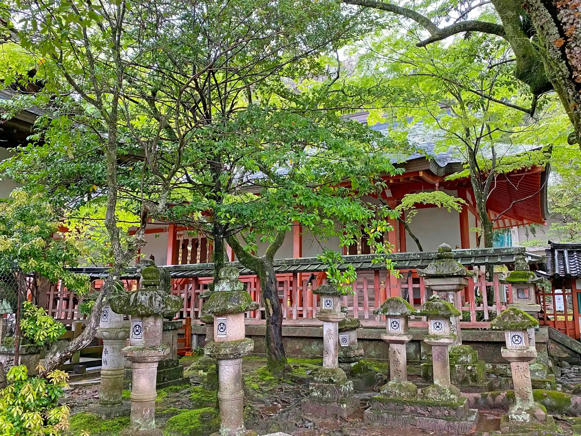 創建は奈良時代の749年、東大寺および大仏を建立するにあたり、東大寺の守護神として九州の宇佐八幡宮を勧請。当初平城宮南の梨原宮に鎮座し、後に東大寺大仏殿南方の鏡池付近に移座。