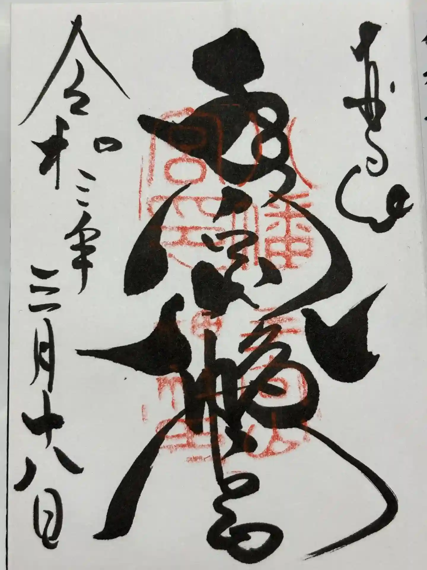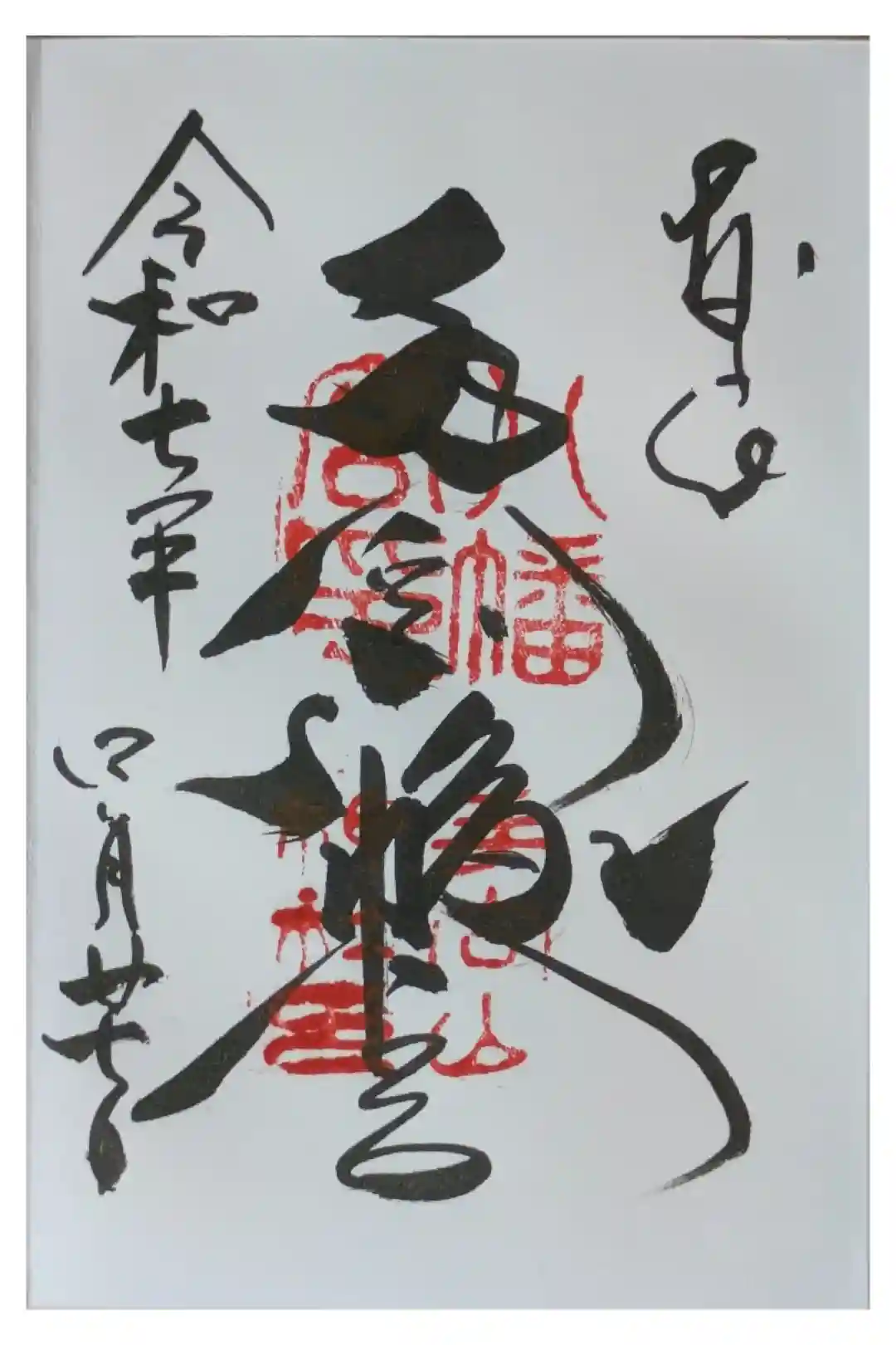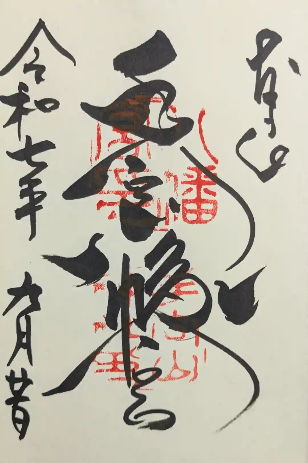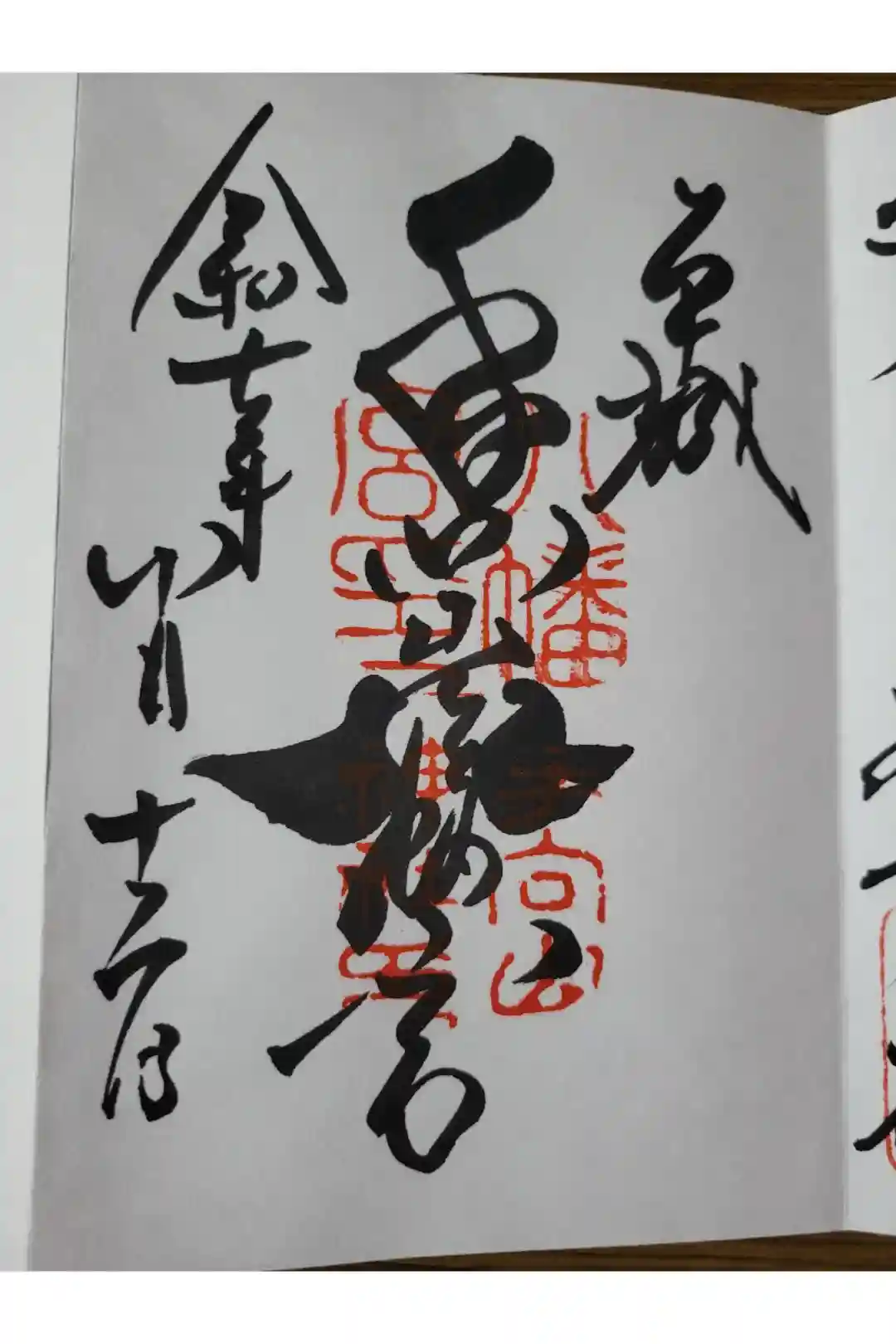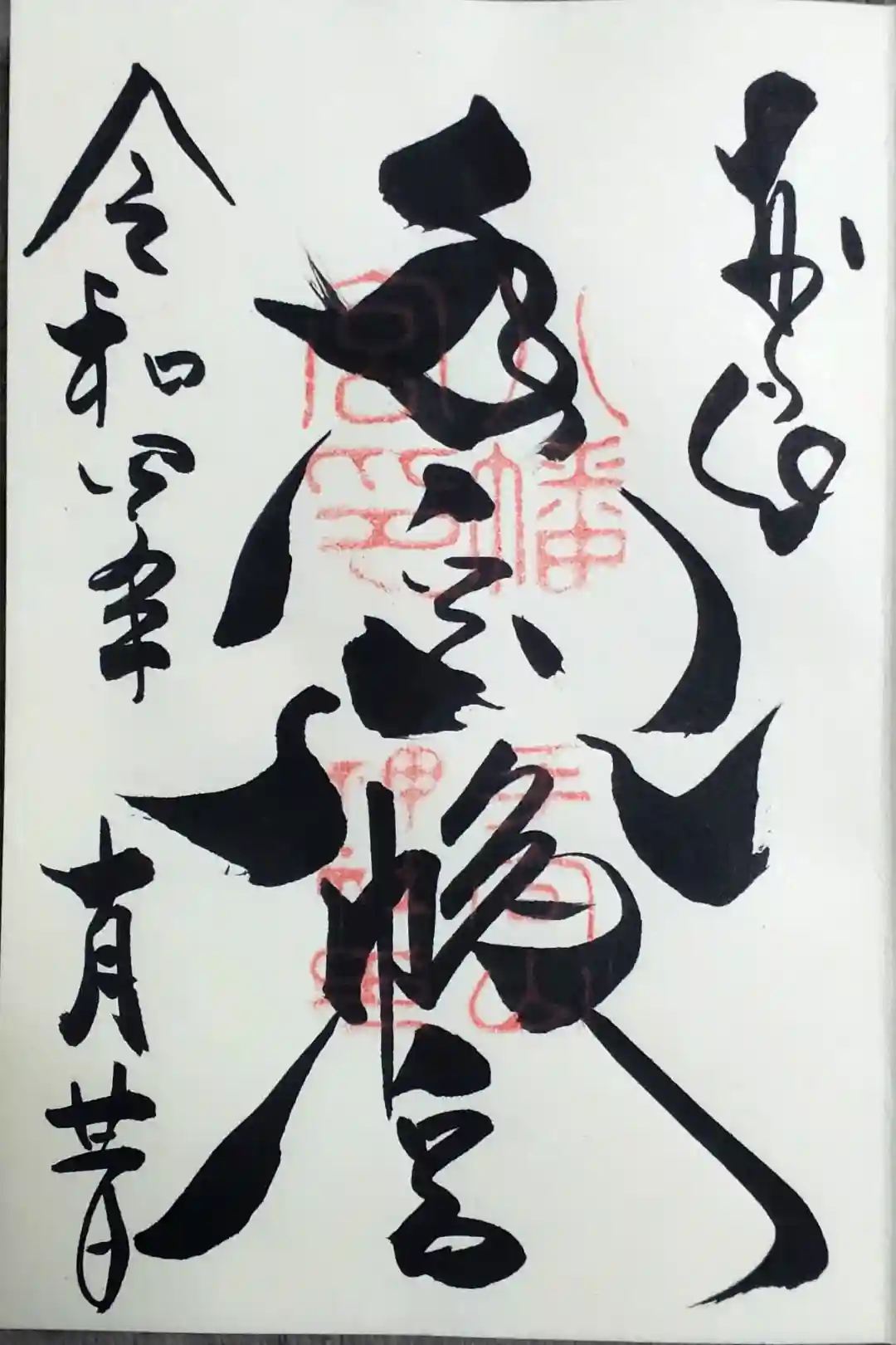 真ん中に「手向山八幡宮」と墨書きされています。八幡宮の「八」が神紋の「向かい鳩」の形になっている珍しい御朱印を頒布しています。 | |||