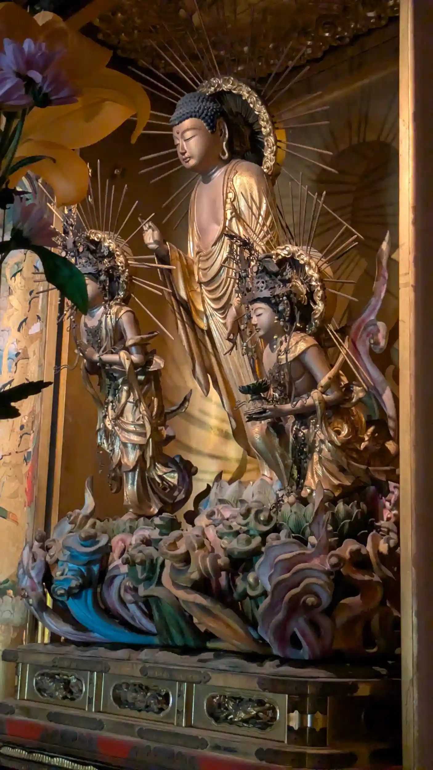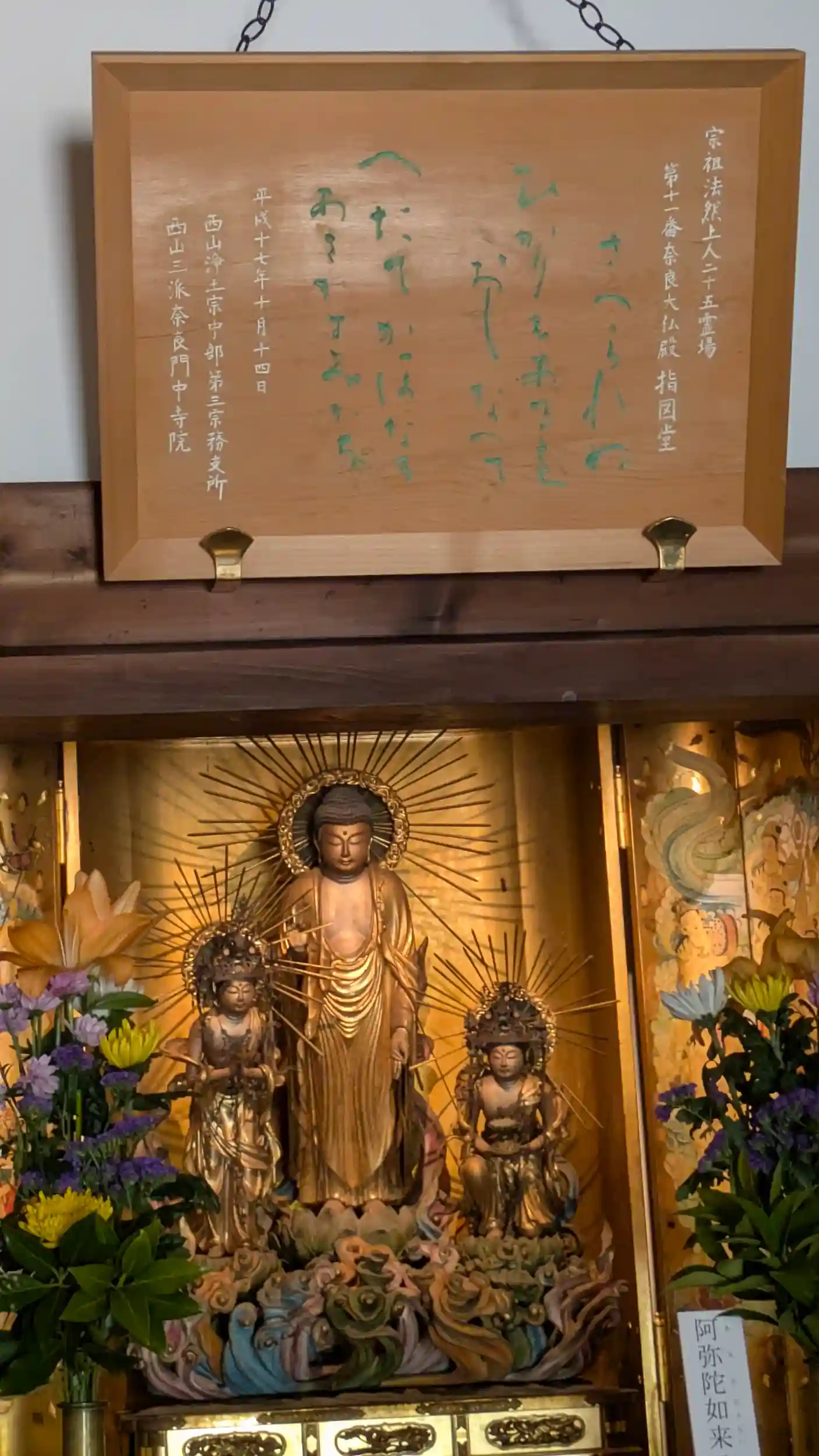 東大寺参拝の主目的。圓光大師二十五霊場第11番。本堂前には八重の桜が🤗堂前の賓頭盧さんに手を合わせて堂内へ。真正面には法然上人の尊像画。合掌念佛し、御朱印を拝受。まあダメもとで「写真撮ったらだめですよね?」とお伺いすると以外にも「良いですよ」とのお返事をいただきありがたくここぞとばかりに撮らせていただきました🤗阿弥陀三尊も美しく、前のめりの来迎スタイルがまた良き😊東大寺らしく浄土宗寺院ではあまり見ない毘盧遮那仏も。大日さんかなと思ったら着衣が大日さんは菩薩着衣なのに対し、こちらは釈迦如来や阿弥陀如来と同じく袈裟をまとい日本では稀なスタイルなのだとか。良いもの拝ませていただけました🤗