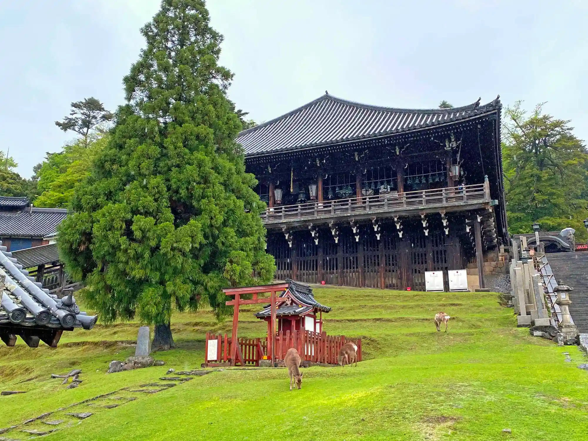 神社全景。十数段の階段があるが、その分だけ西向きの景色が二月堂からの景色と比べて違うらしい(より遠くの生駒山あたりまで見えるらしい)。