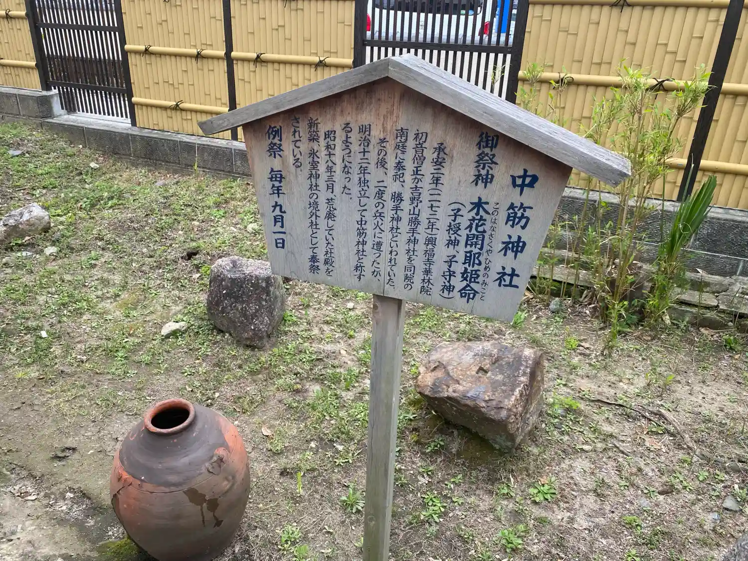 神社の由緒を記した案内板によると、「中筋神社」と称されるようになったのは明治12年(1879年)のこと。それ以前の詳細な経緯については記されていませんでしたが、地域の中で長く信仰を集めてきたことがうかがえます。また、昭和18年(1943年)には、奈良市春日野町にある氷室神社の境内社となったそうです。氷室神社といえば、毎年“氷の神様”に氷を奉納することで知られる古社であり、その関係から中筋神社にも特別な由来や役割があるのかもしれません。