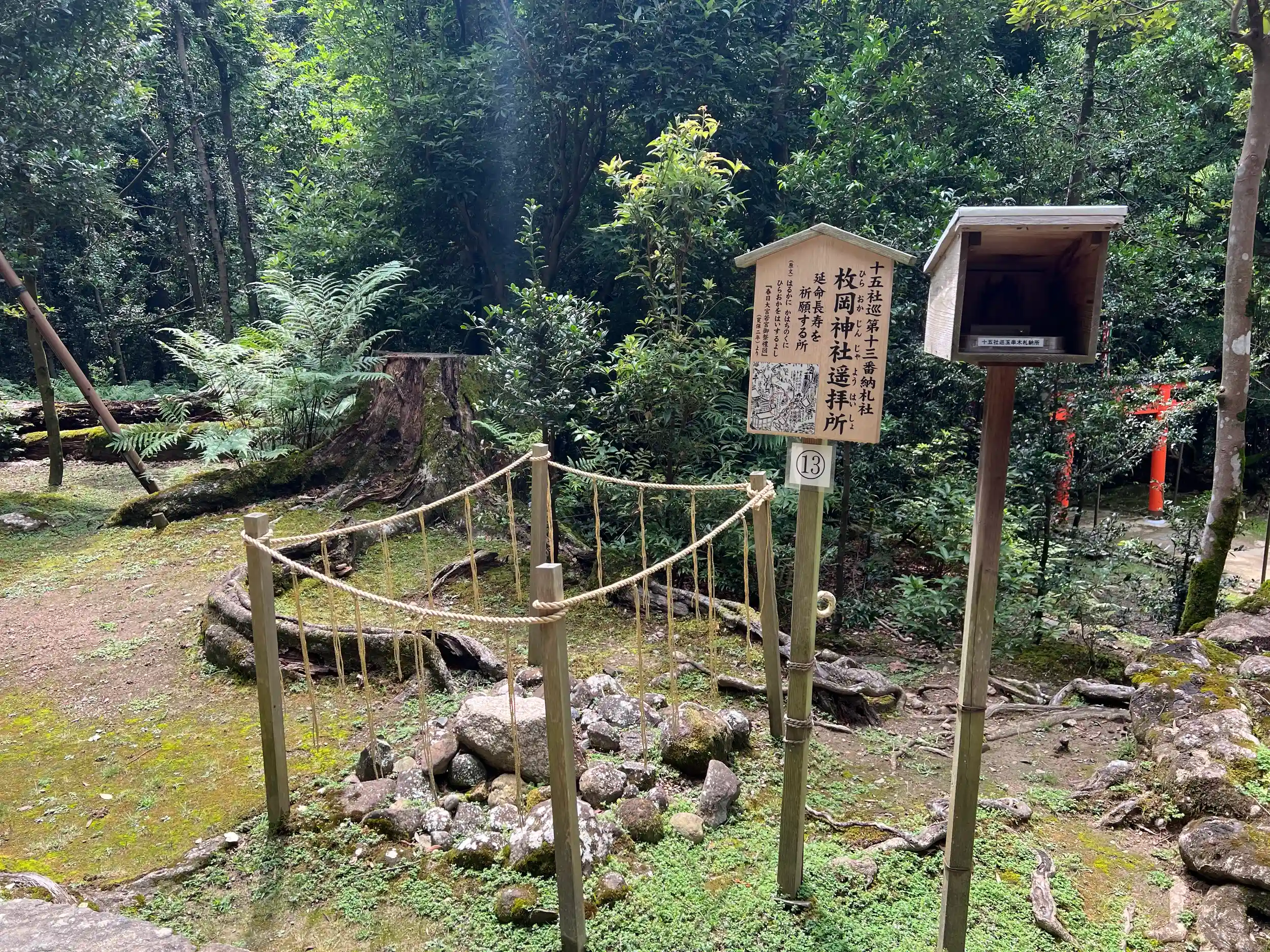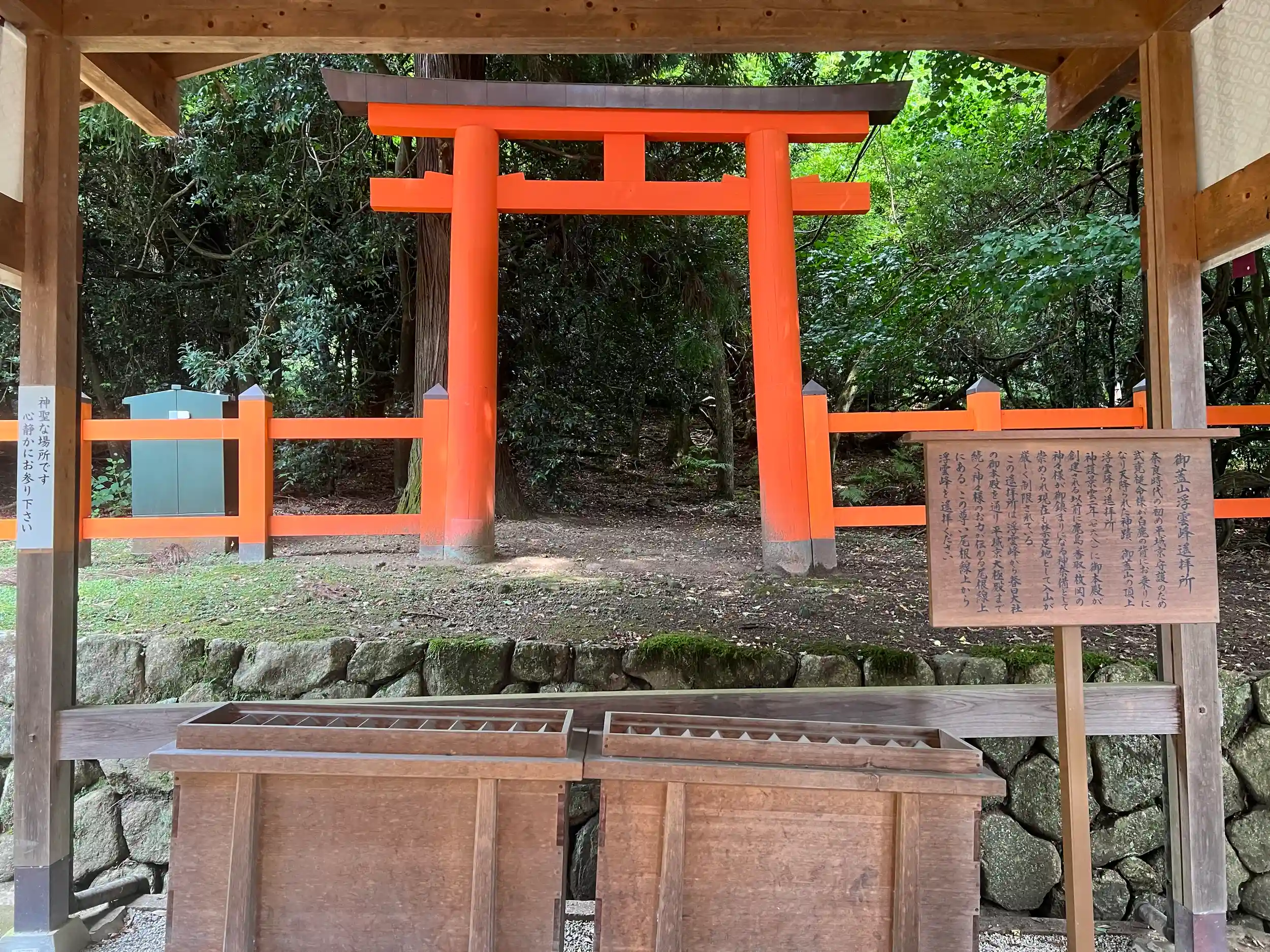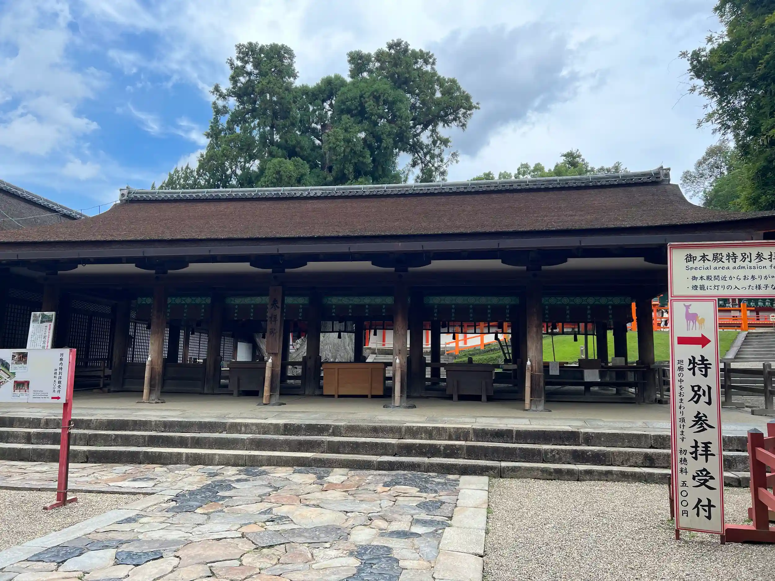 幣殿よりその中「特別参拝」(有料)では、①より近くで御本殿にお参りすることができる中門前での参拝や、②第一殿の神様「武甕槌命」(たけみかづちのみこと)が、鹿嶋神宮から白い鹿に乗って降り立った地である「御笠山」の頂上を遥拝する場所(御蓋山浮雲峰遙拝所)、③万燈籠を再現した施設(藤浪之屋)などを巡ることができます。