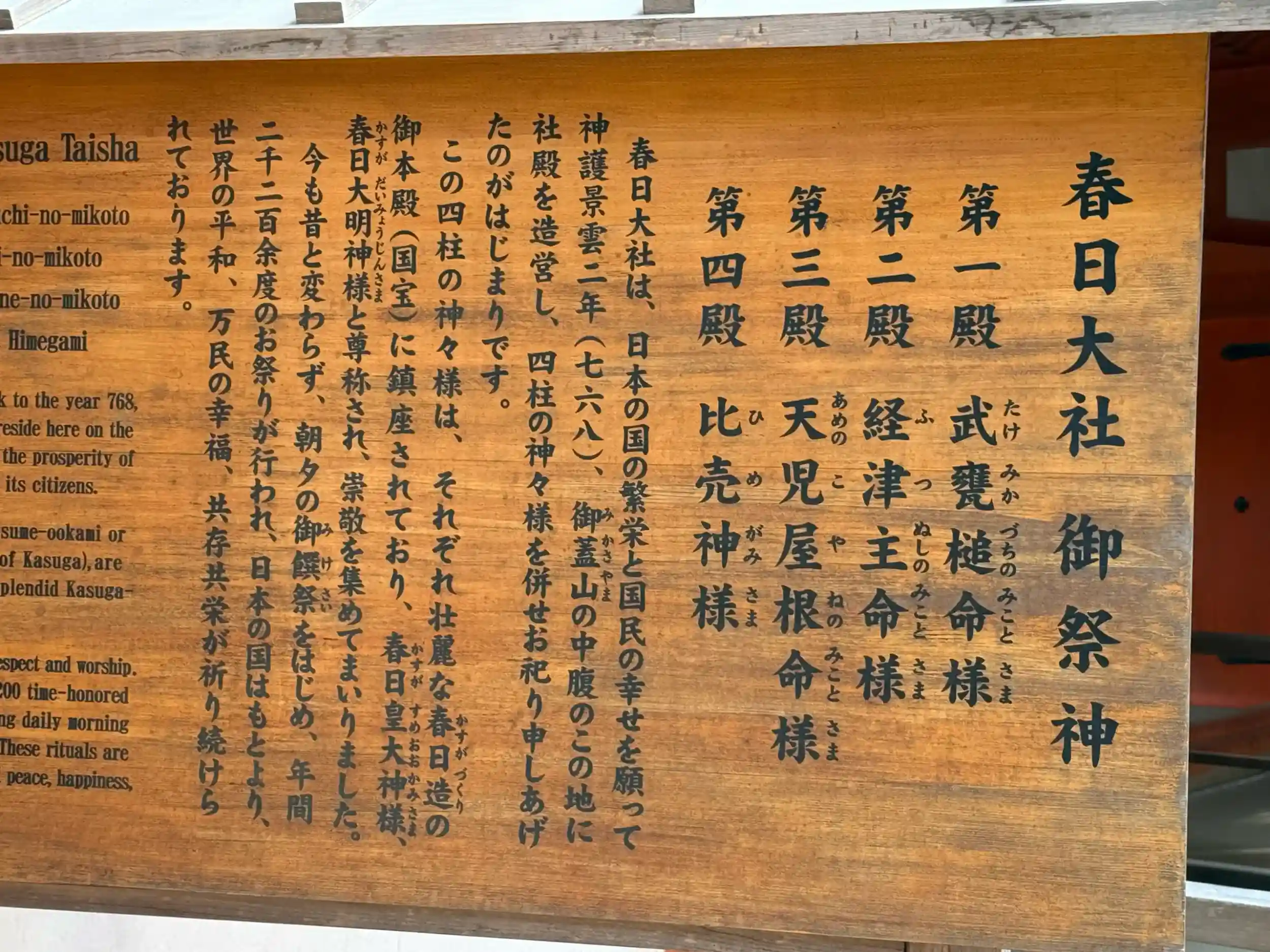 ご本殿に祀られる四柱の神様、第一神(武甕槌命)と第二神(経津主命)は藤原氏の氏神様で、第三神(天児屋根命)と第四神(比売神)は藤原家のご先祖とされます。