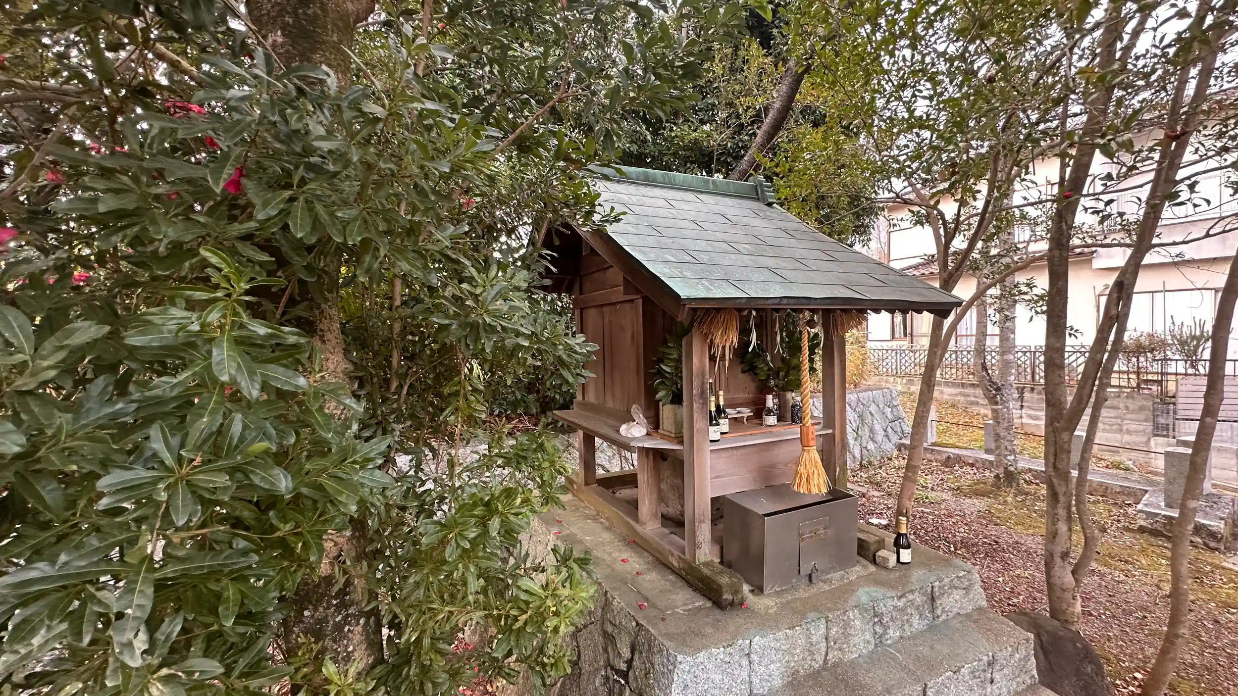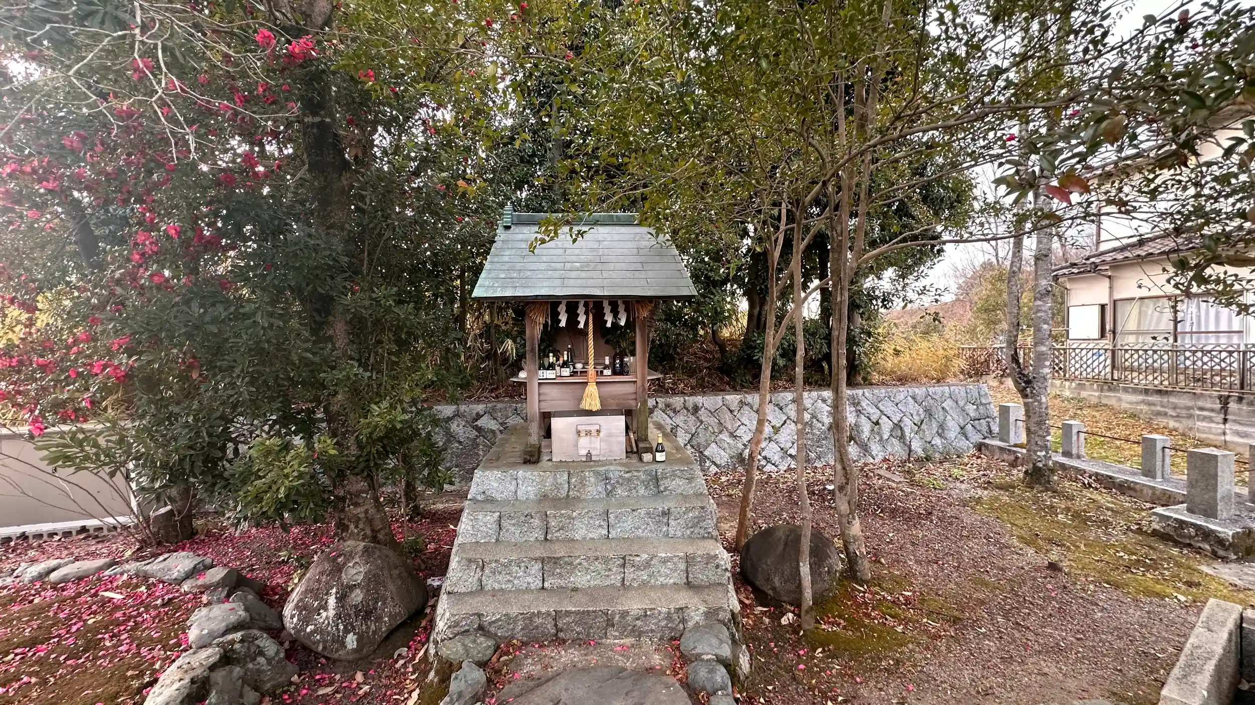辰年に龍神様参拝⑮ 素盞鳴神社 (生駒市鹿畑町)の飛地末社の一つ 住宅街の端に鎮座されています、境内には赤い椿の花が散り始めていました、沢山のお酒が備えられていました