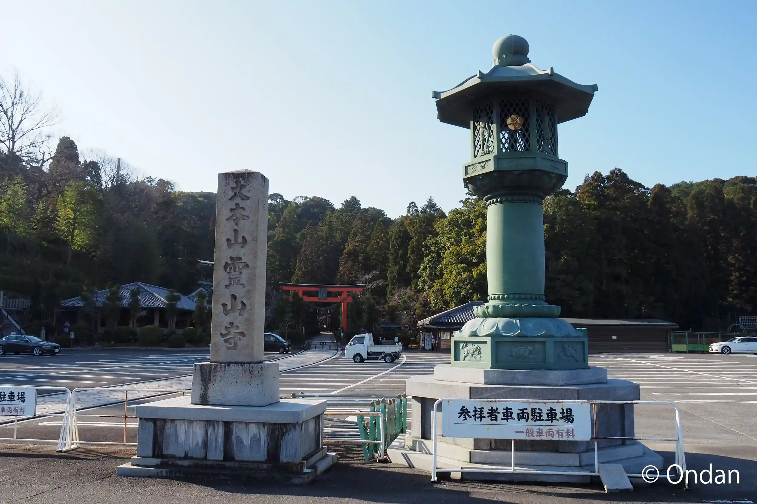 寺号標。奥は広大な駐車場ですが、今日はまばら。
