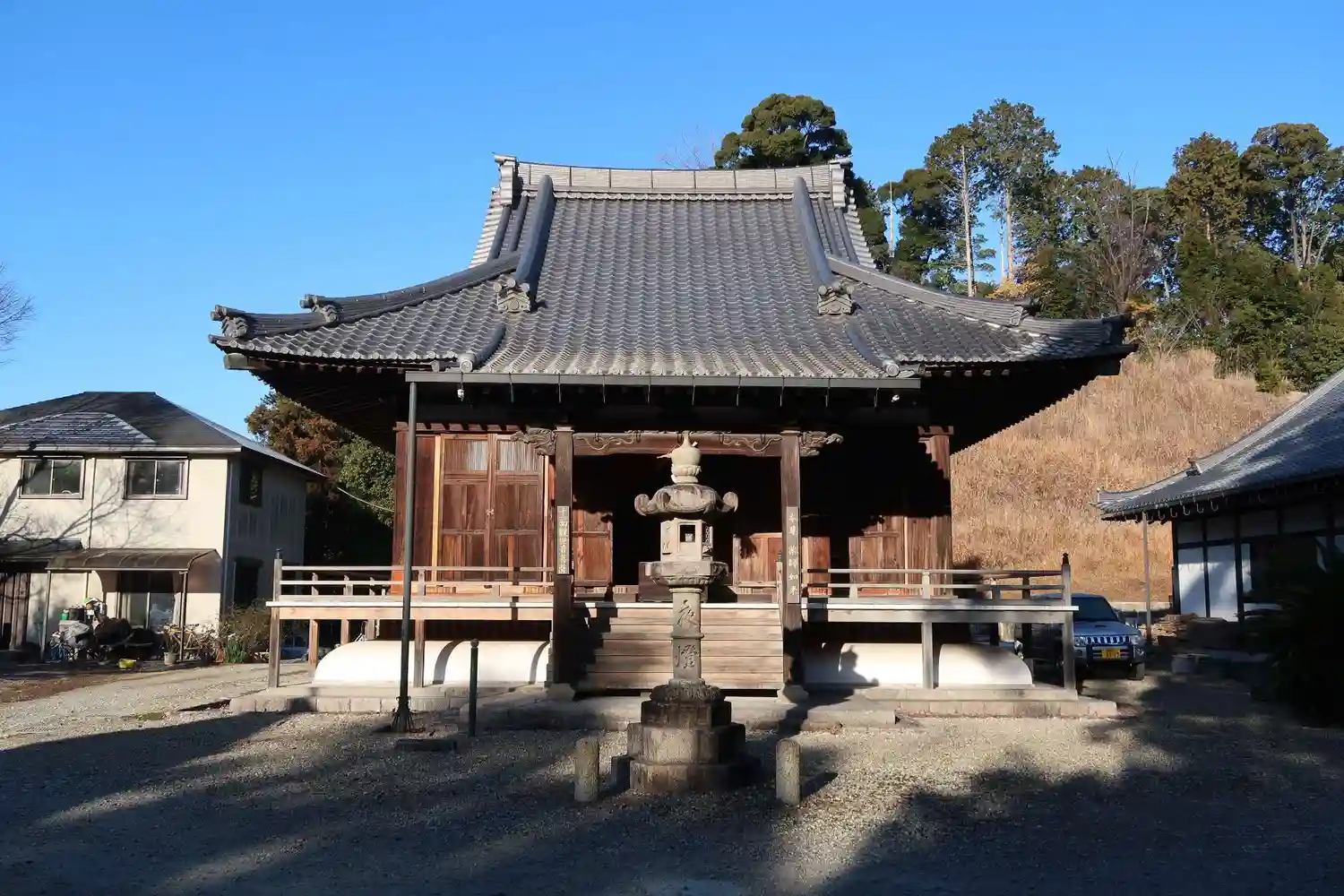 車で参道を少し上がって行くと境内に出ました。車の通った跡がありましたので、隅に停めさせて頂きました。真ん前に本堂、左に鐘楼で、その奥に三十三観音がありました。本堂の扉は開いていましたが勝手に入ってよいのかわからなかったので本坊(庫裏)へ伺いました。尚、境内地の手前に門があり、門の正面は本坊(庫裏)でした。