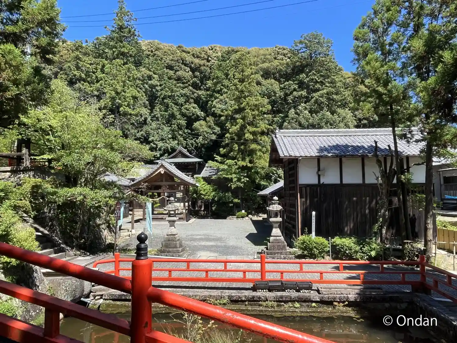 参道に見える朱塗りの橋。