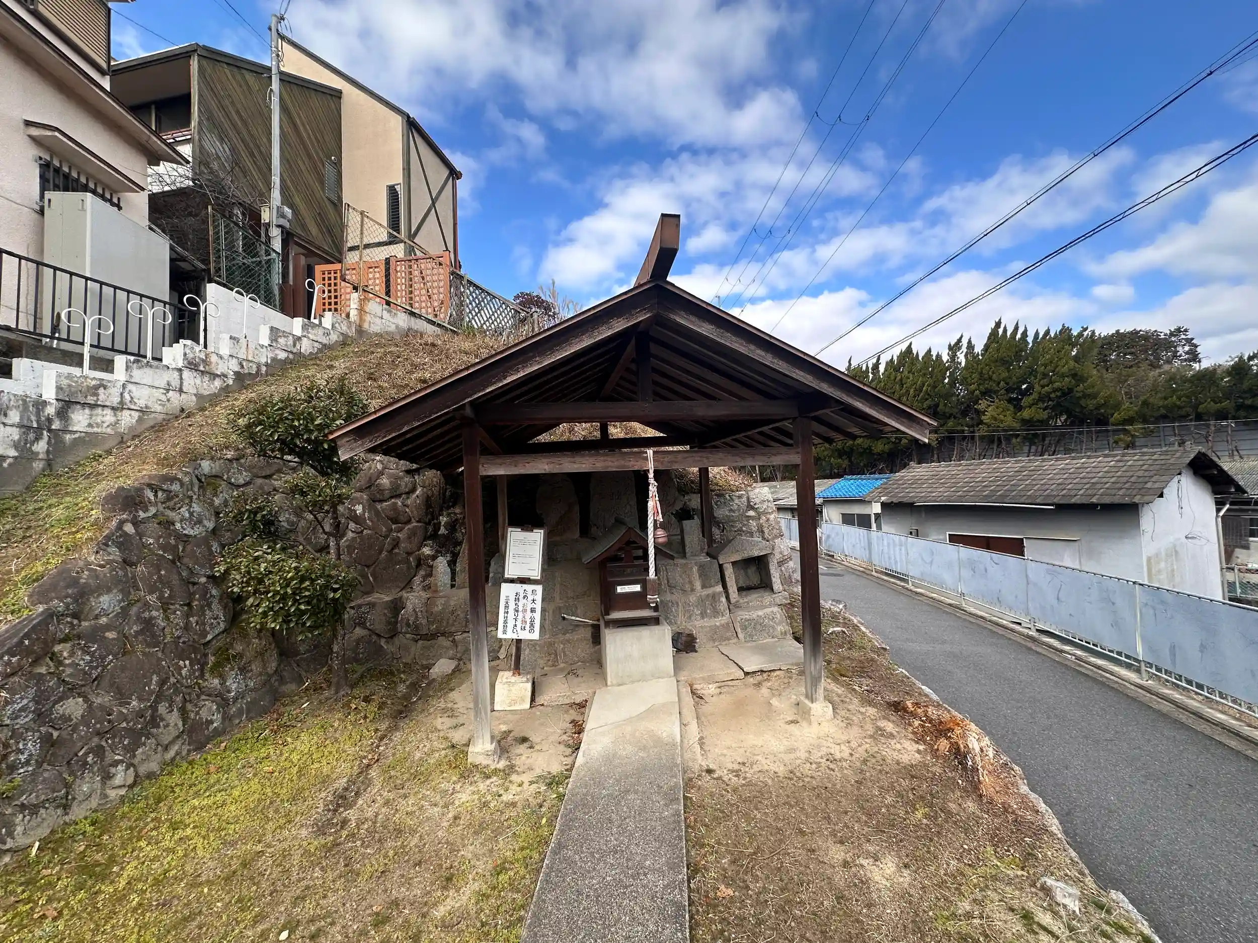 三太郎と聞いてまさかCMのと思いましたが、タヌキの神様と思われます。タヌキ神なので稲荷神社のコマギツネのようにコマダヌキでもいるとかわいいと思うのですが、そんな思いとは逆にとても悲しいお知らせが貼ってあります。比較的新しい住宅地なのに後継者がいないのでしょうか寂しくなります
