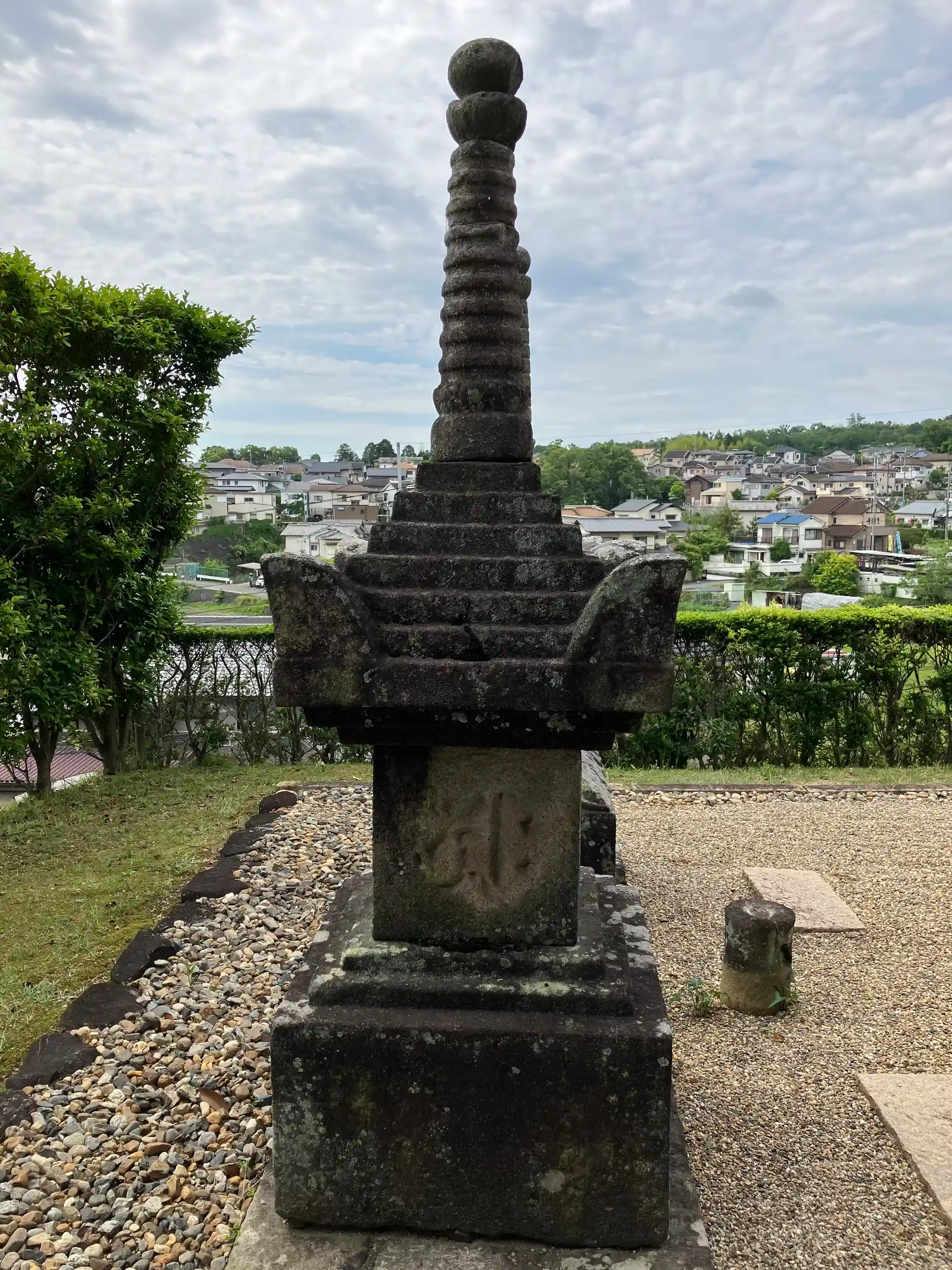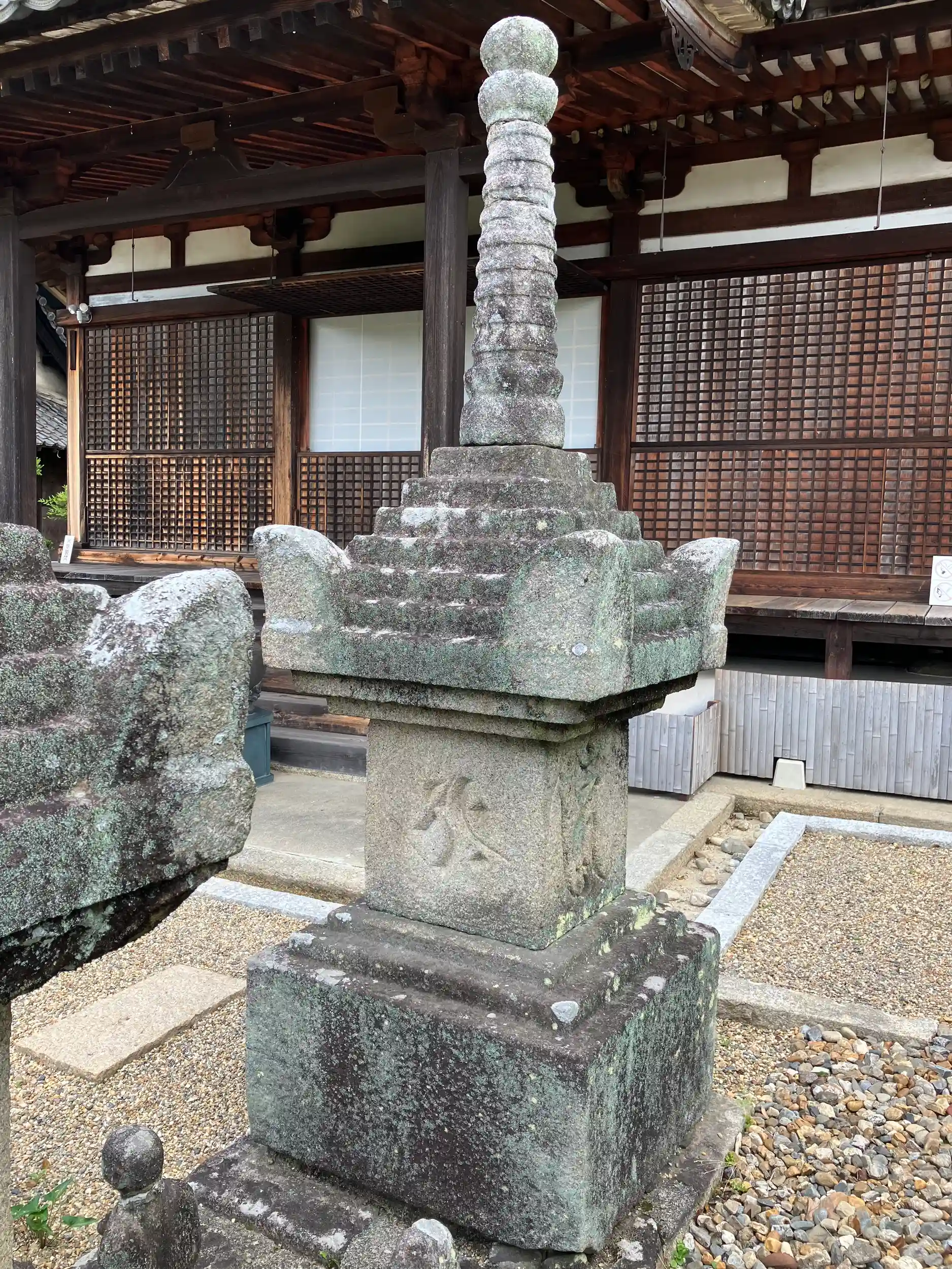 現在の本堂は1371年の再建。本堂前の2基の宝篋印塔のうち、写真左側のものが1293年の建造、右側のものも鎌倉時代の同時期に建造されたとされる。